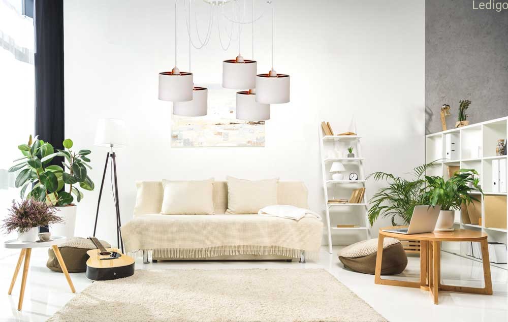 5 kloszy z możliwością wymiany - każdy pojedynczy klosz jest dostosowany do opraw z grubym gwintem. Abażur materiałowy z kolekcji Oro w biało-złotym kolorze.