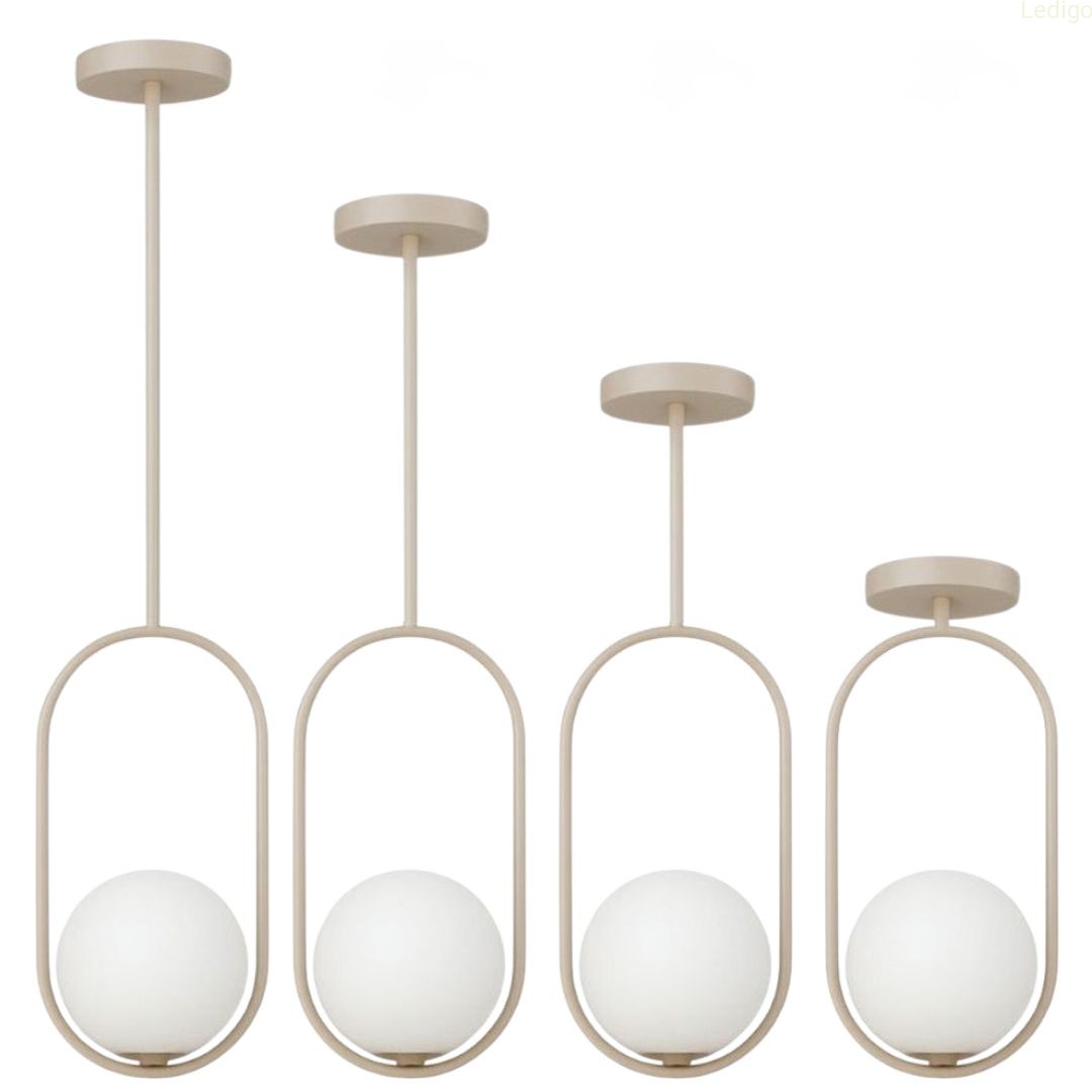 Niezwykle elegancka lampa wykonana z metalu w kolorze beżowym z podwieszonym mlecznobiałym kloszem.