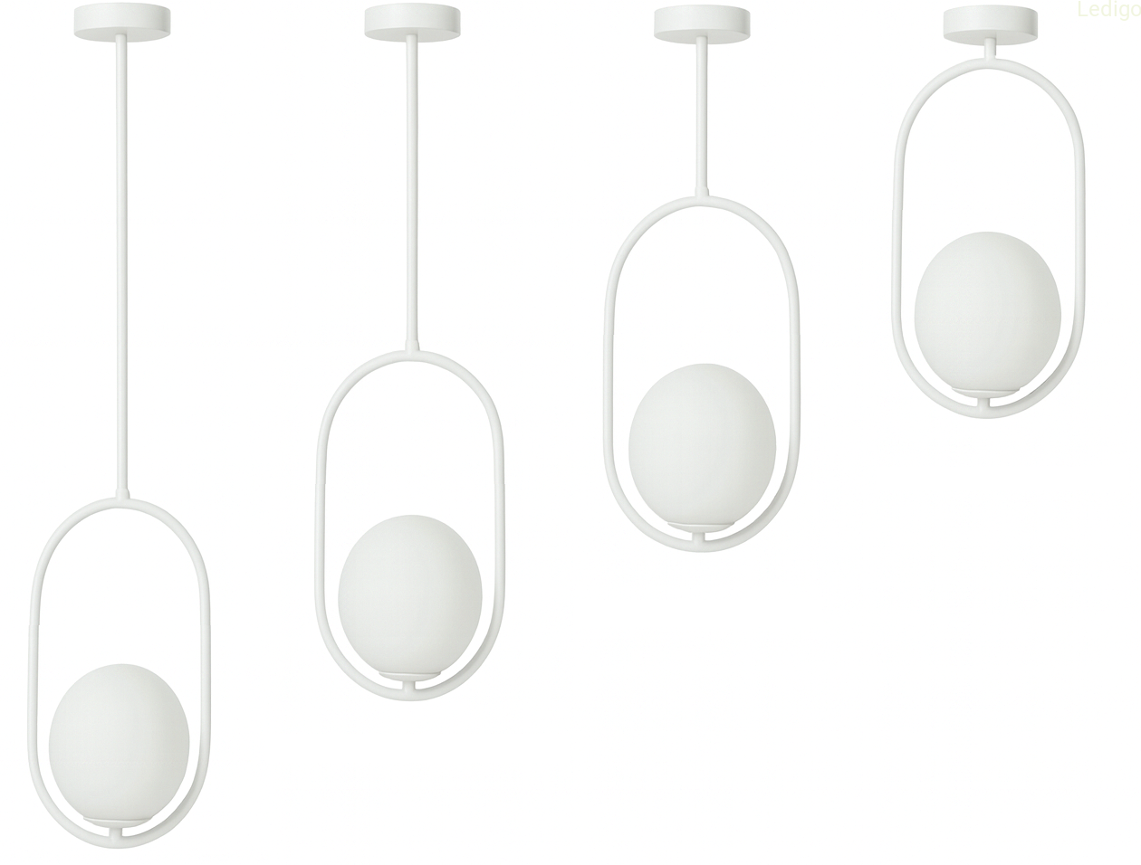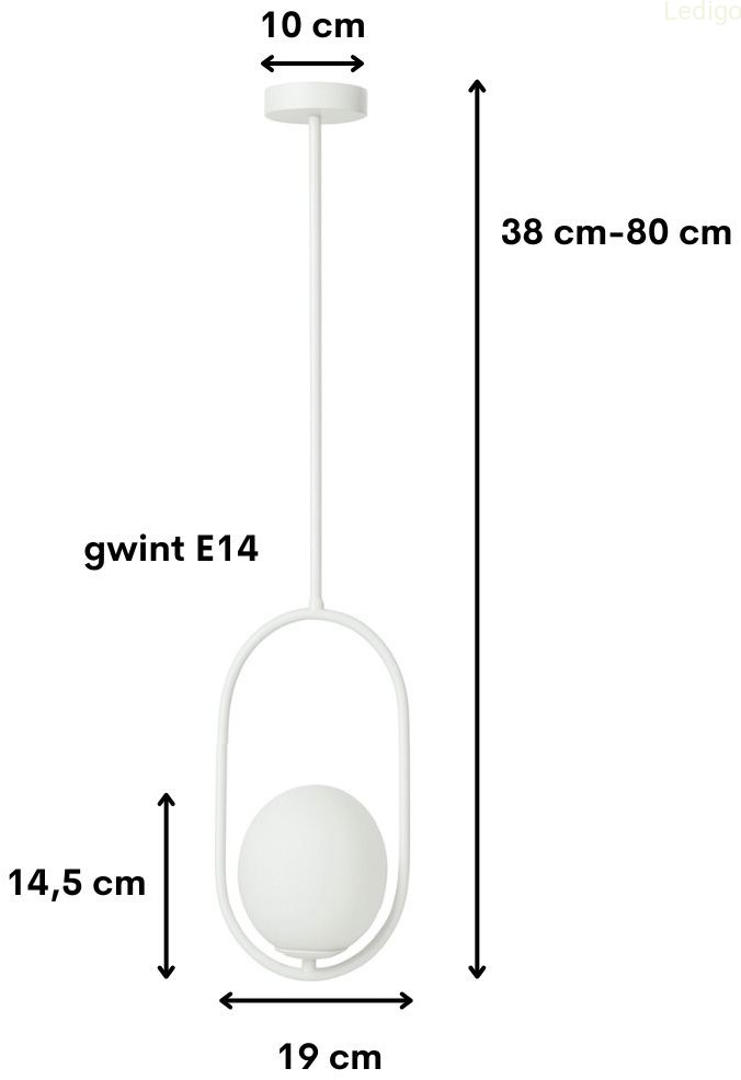 Rodzaj lampy: lampa wisząca Dwuobwodowość: nie Rodzaj gwintu: E14 Styl: nowoczesny Tworzywo: metal + szkło Kolor klosza: mleczny Kolor uchwytu: biały Kolor podstawy lampy: biały Kolor kabla: Biały Kolor podsufitki: biały Wysokość całkowita: od 38cm do 80cm Szerokość całkowita: 19cm Głębokość klosza: 14cm Uwaga! Należy zastosować żarówkę o maksymalnej wysokości 10 cm i średnicy 3,5cm Szerokość klosza: 14,5cm Wysokość klosza: 14,5cm Średnica maskownicy: 10cm Waga produktu: 1,050kg Możliwość ściemniania: w zależności od żarówki Stopień ochrony IP: IP20 Regulacja wysokości: tak Napięcie: 230V Źródło światła w zestawie: nie Czas realizacji: 24h