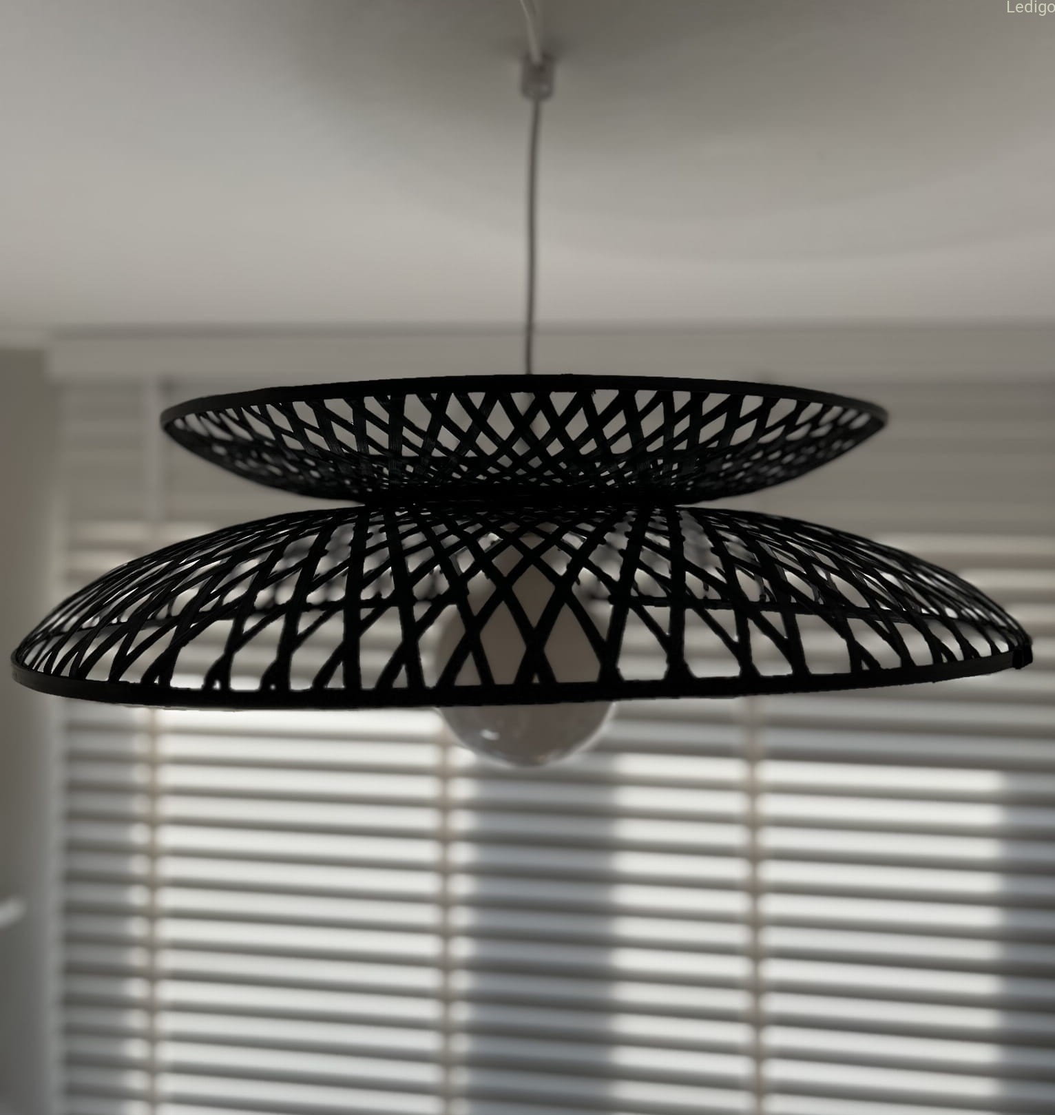 Lampa jest wspaniałą kompozycją światła i natury, która przenosi Cię w podróż do orientalnego spokoju. Wyjątkowy design tej lampy bazuje na harmonijnym połączeniu dwóch części w formie talerzy - okrągłych kształtów wykonanych z wytrzymałej plecionki bambusowej. Te pięknie utworzone koła splatają się ze sobą, tworząc spójny i harmonijny układ, a ich subtelne złączenie w dolnej części dodaje lampie charakterystycznego uroku.