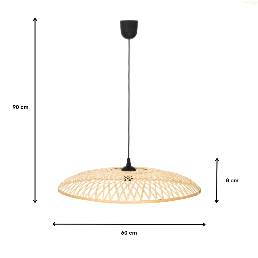 Rodzaj lampy: lampa wisząca Dwuobwodowość: nie Rodzaj gwintu: E27 Styl: boho Tworzywo: bambus Kolor klosza: beżowy Kolor uchwytu: Czarny Kolor podstawy lampy: Czarny Kolor kabla: Czarny Kolor podsufitki: Czarna Wysokość całkowita: 90 cm Szerokość całkowita: 60 cm Szerokość klosza: 60 cm Wysokość klosza: 8 cm Średnica maskownicy: 9,5 cm Długość kabla: 80 cm Waga produktu: 0,450 kg Stopień ochrony IP: IP20 Regulacja wysokości: tak Napięcie: 230V Źródło światła w zestawie: nie