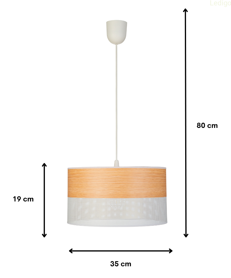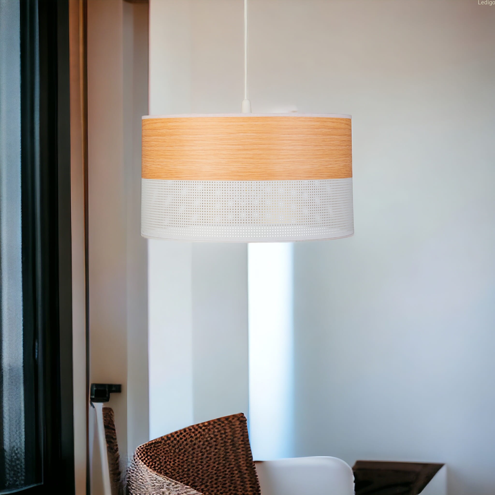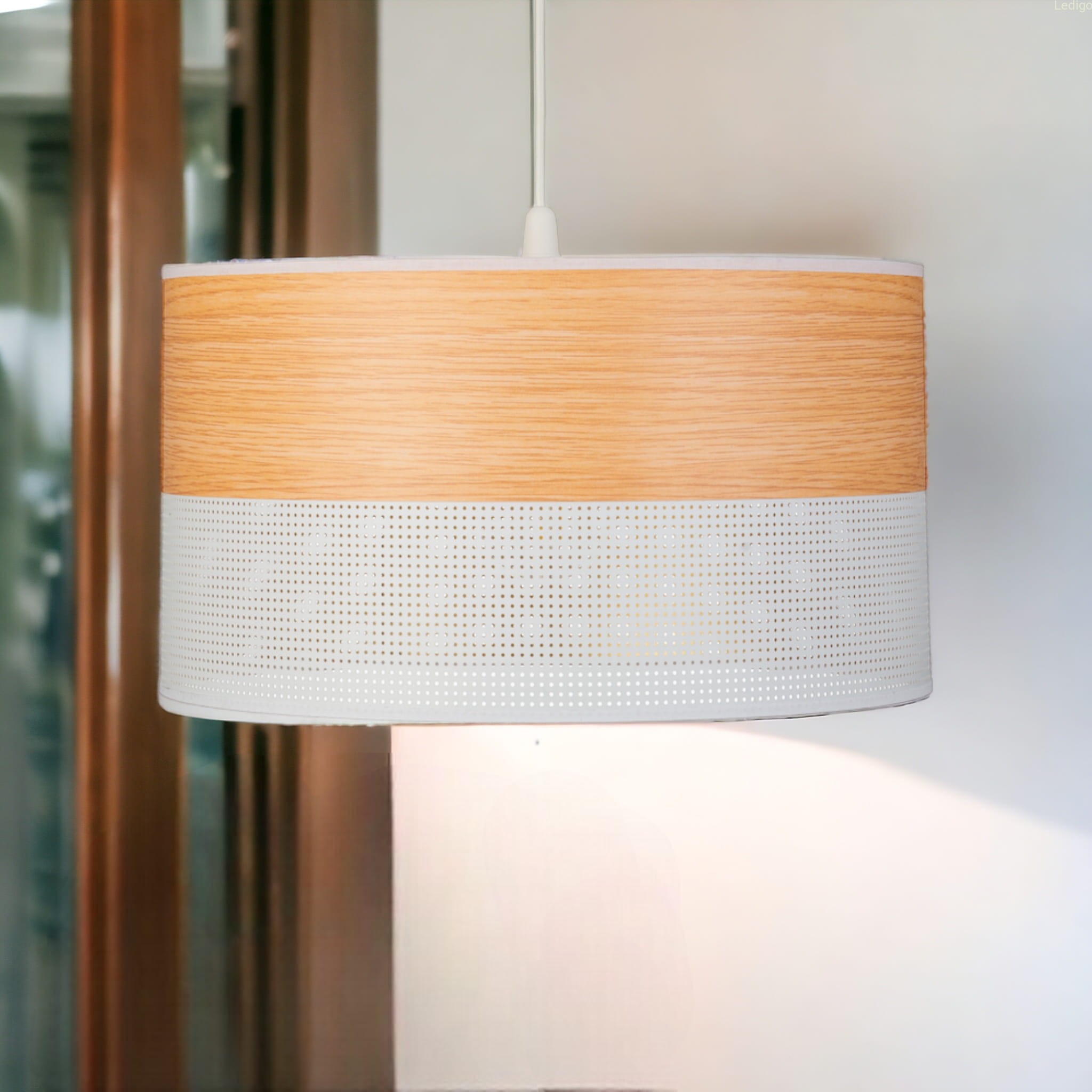 Lampa wisząca jasny dąb fornir biała abażur złoty środek
