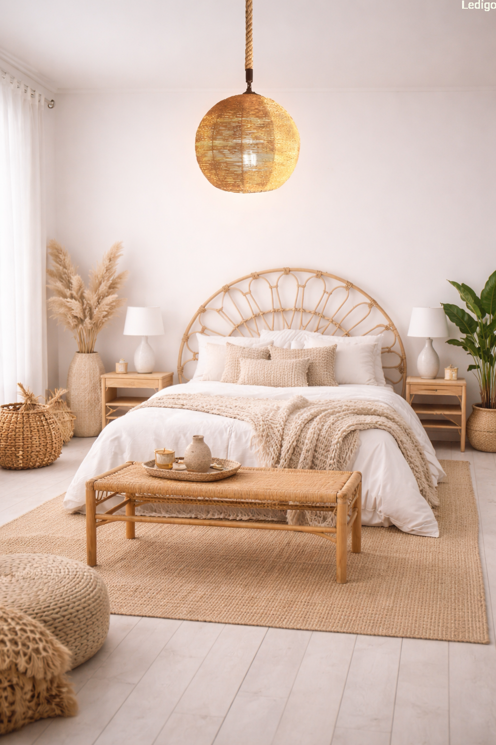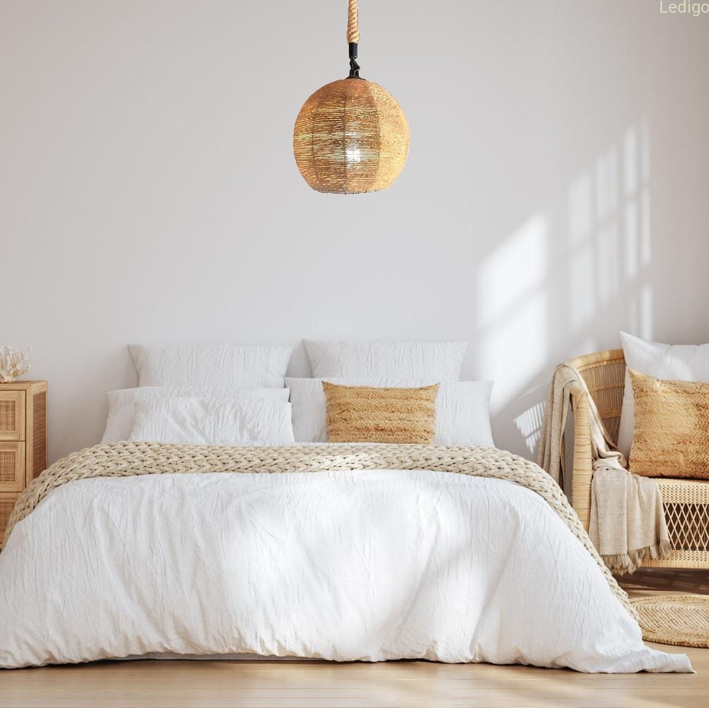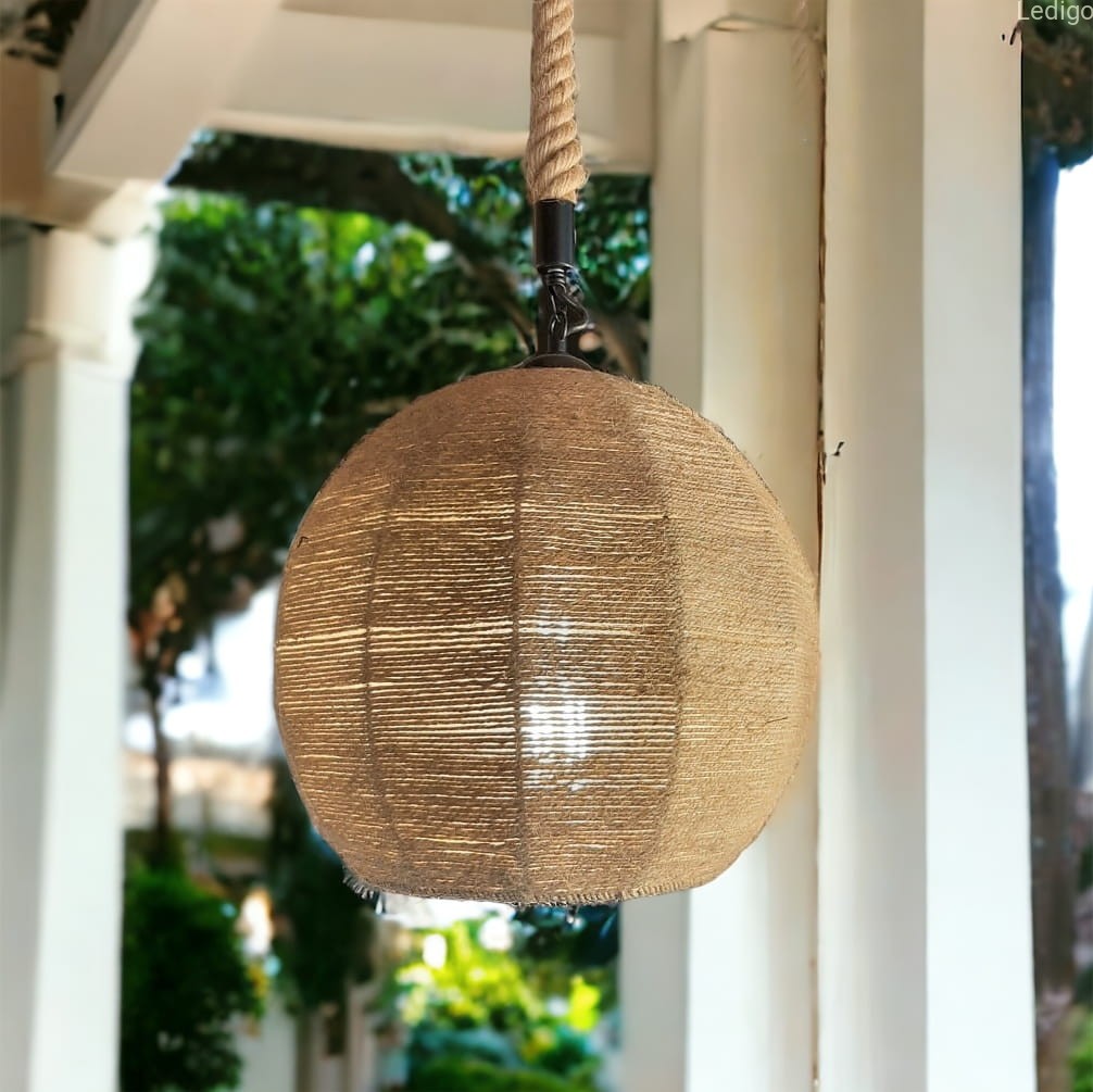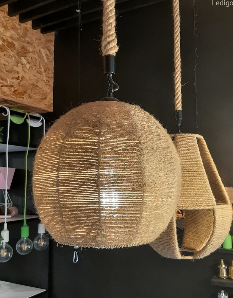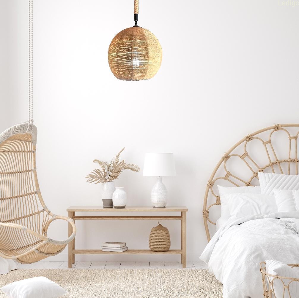 EKO DESIGN - klosz lampy opleciony jutowym sznurkiem nadającym lampie eko design. Wystarczy dobrać dekoracyjne źródło światła a lampa rozświetli wnętrze i nada nowy charakter. Lampa w stylu boho świetnie komponuje się we wnętrzach inspirowanych naturą. Przepięknie prezentuje się na tle drewna szarości i ceramiki. Ociepli wizualnie wnętrze Pasuje do kuchni i salonu ale także do sypialni czy pokoju dziecięcego.