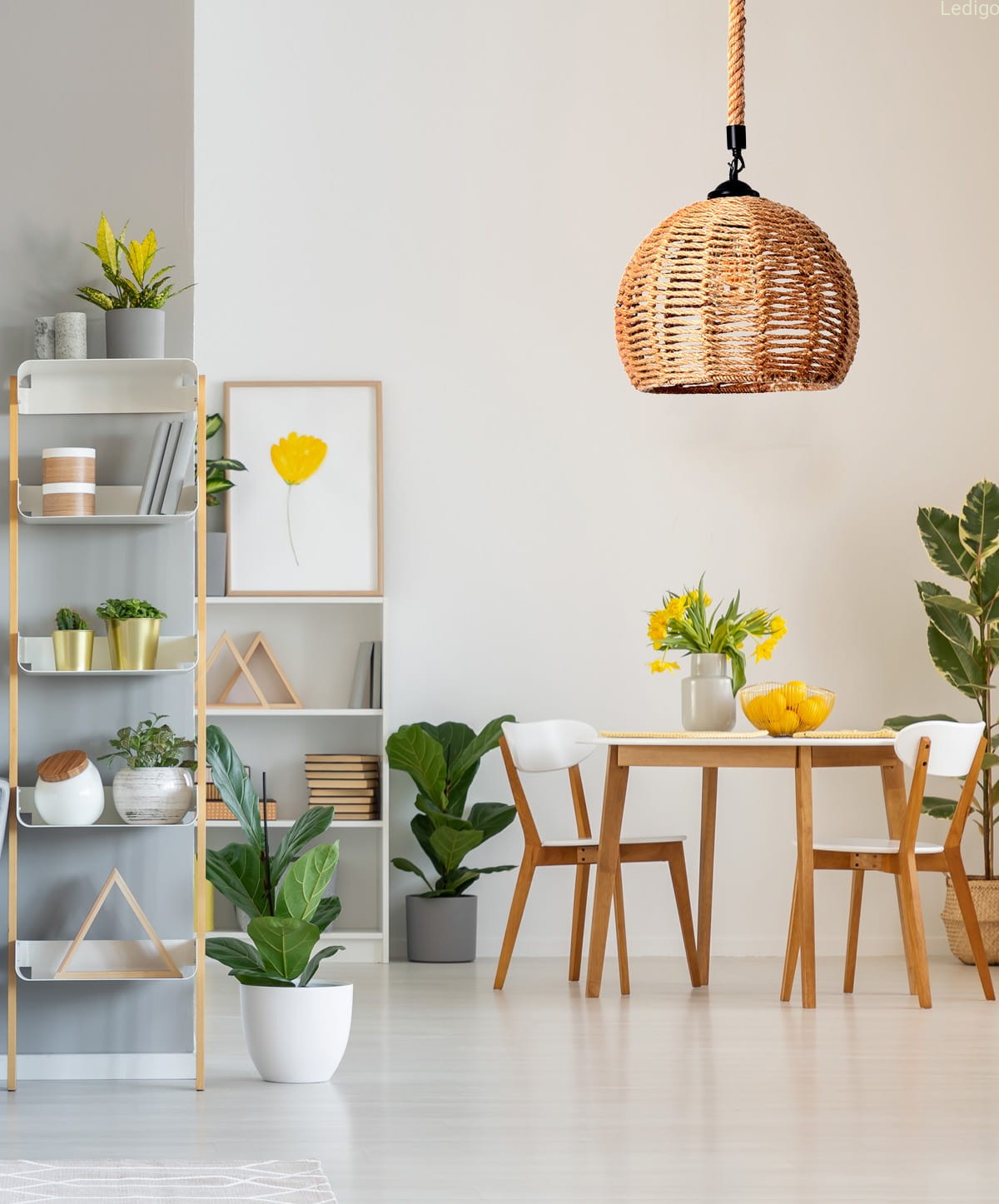 KONSTRUKCJA KLOSZA W OPLOCIE JUTOWYM tworzy oryginalny design. Lampa świetnie pasuje do wnętrz inspirowanych naturą. Sprawdzi się w salonie nad stołem czy wyspą. Ze względu na swój rozmiar pasuje także do sypialni czy młodzieżowego pokoju.