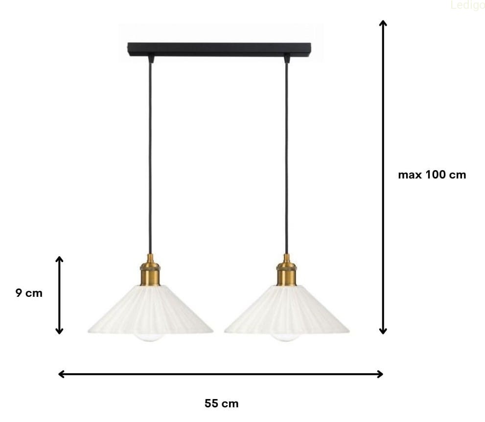 Rodzaj lampy:lampa wiszącaDwuobwodowość:nieRodzaj gwintu:E27Styl:nowoczesnyTworzywo:szkłoKolor klosza:mlecznyKolor uchwytu:złotyKolor kabla:czarnyKolor podsufitki:czarnyWysokość całkowita:100cmSzerokość całkowita:55cmSzerokość klosza:25cmWysokość klosza:9cmŚrednica maskownicy:długość listwy 40cm, szerokość listwy 5cm, wysokość listwy 2cmDługość kabla:90cmWaga produktu:2,400kgMożliwość ściemniania:w zależności od żarówkiStopień ochrony IP:IP20Regulacja wysokości:takNapięcie:230VŹródło światła w zestawie:nieCzas realizacji:24h