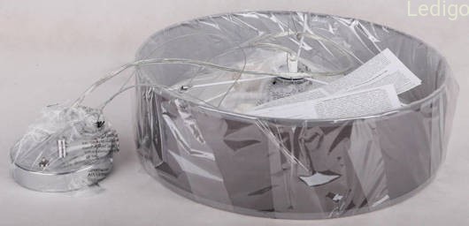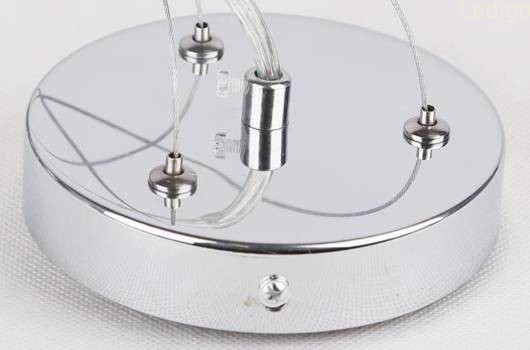 Abażur mocowany jest do chromowej podstawy, trzema metalowymi linkami z mechanizmem regulacji wysokości.