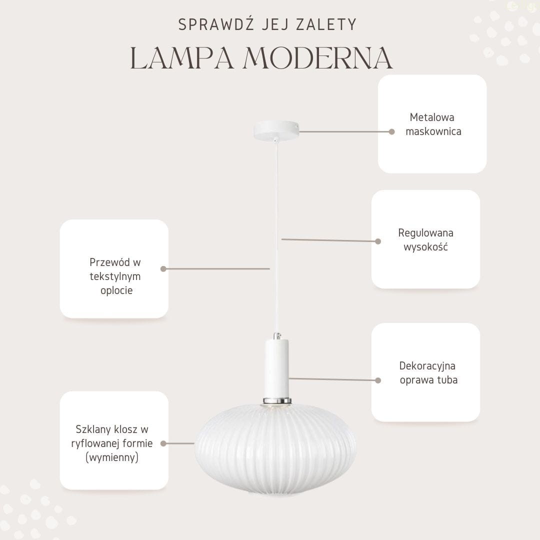 Co ważne lampa posiada możliwość regulacji wysokości zawieszenia. Przewód na którym jest zawieszona można swobodnie skrócić i zdecydować samemu na jakiej wysokości ma być zawieszony klosz lampy