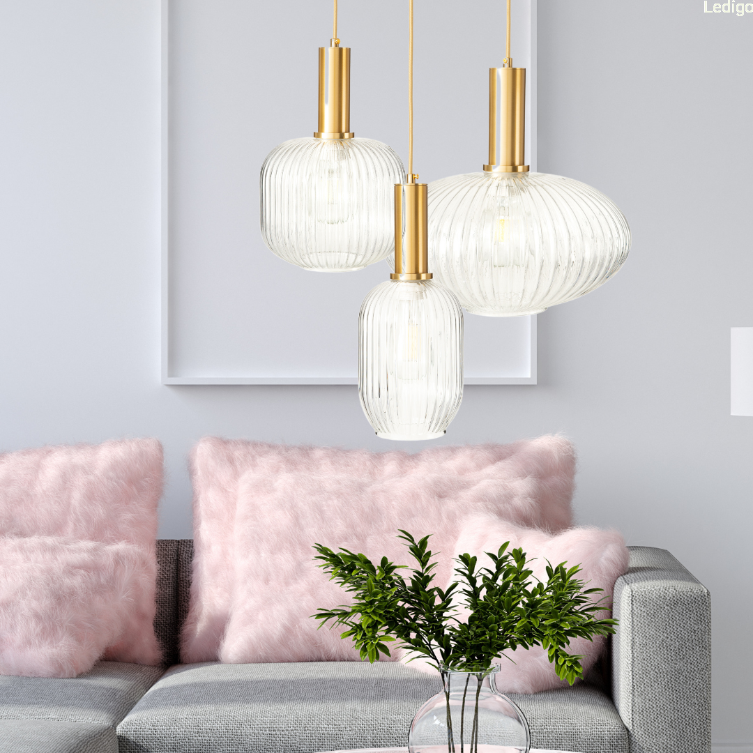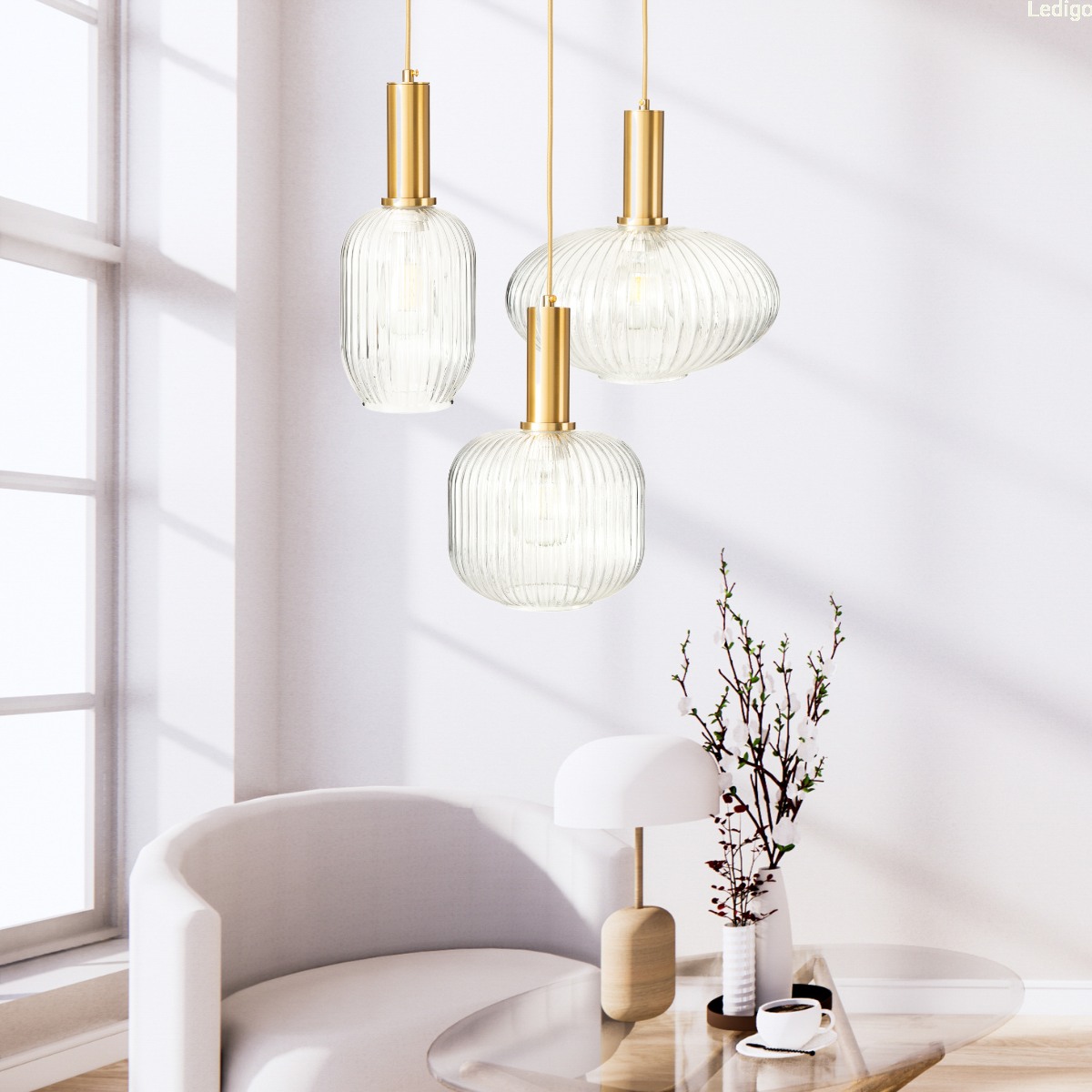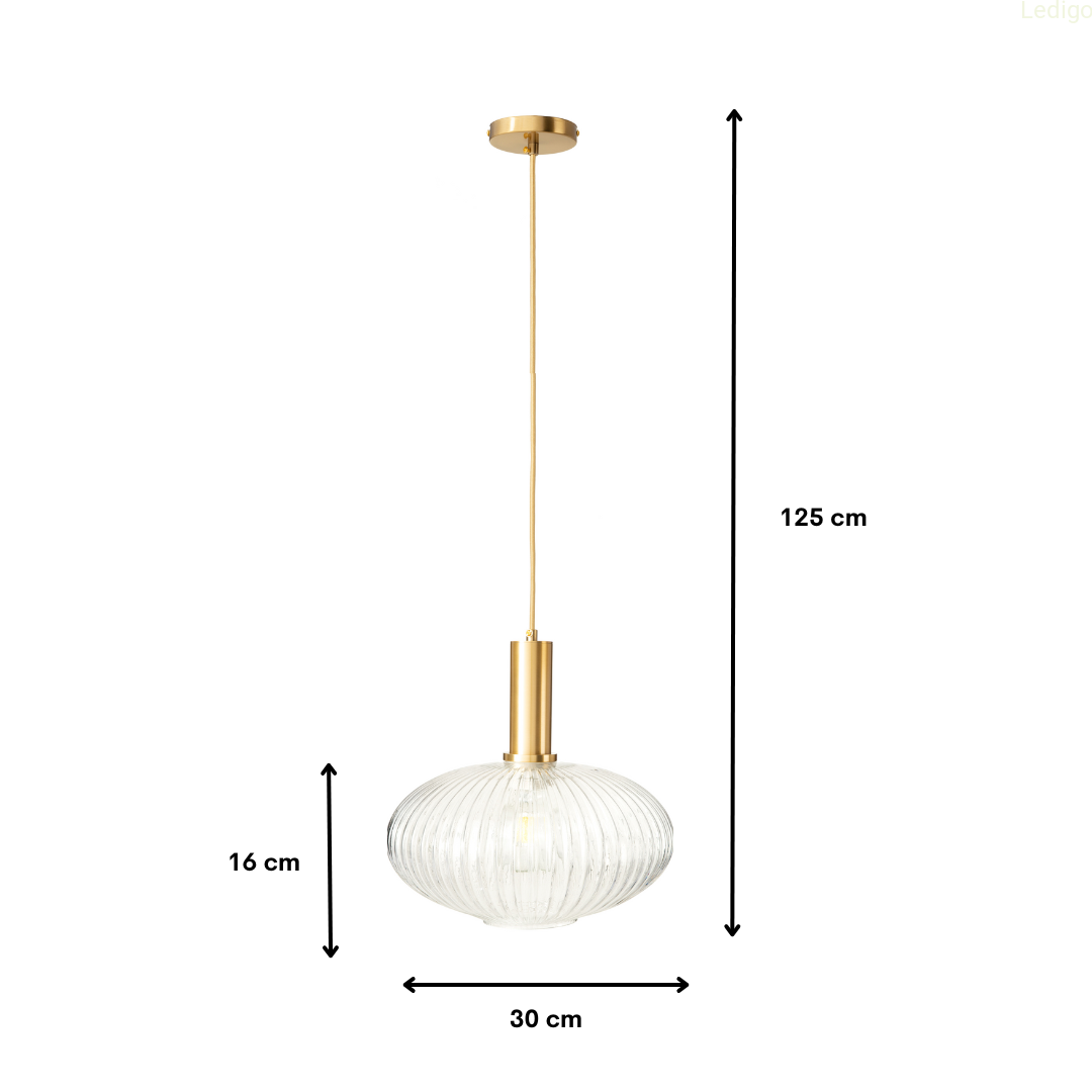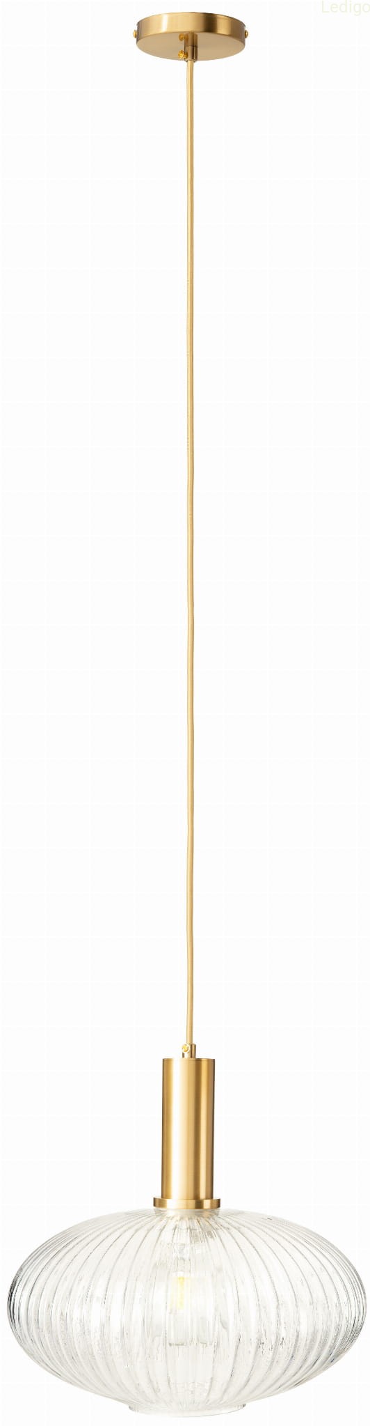 Rodzaj lampy: lampa wisząca Dwuobwodowość: nie Rodzaj gwintu: E27 Styl: nowoczesny Tworzywo: szkło Kolor klosza: przezroczysty Kolor uchwytu: Złoty Kolor kabla: złoty w oplocie tekstylnym Kolor podsufitki: Metalowa, złota Wysokość całkowita: 125 cm Szerokość całkowita: 30 cm Szerokość klosza: 30 cm Wysokość klosza: 16 cm Średnica maskownicy: 10 cm Długość kabla: 95 cm Waga produktu: 1,400 kg Stopień ochrony IP: IP20 Regulacja wysokości: tak Napięcie: 230V Źródło światła w zestawie: nie Czas realizacji: 24h