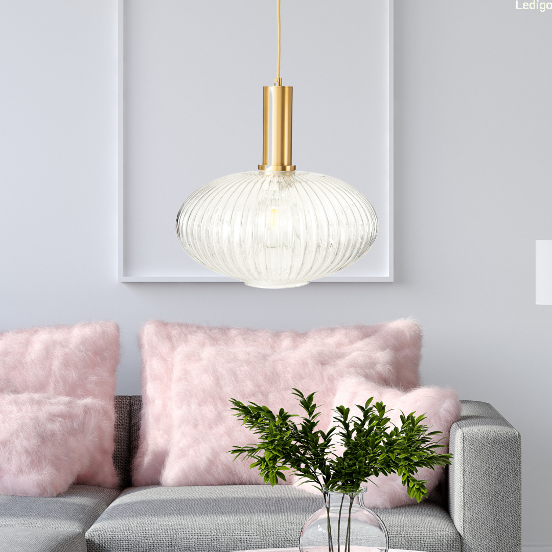 Prezentowaną lampę wyróżnia lustrzany blask i ryflowana forma (falowane szkło)