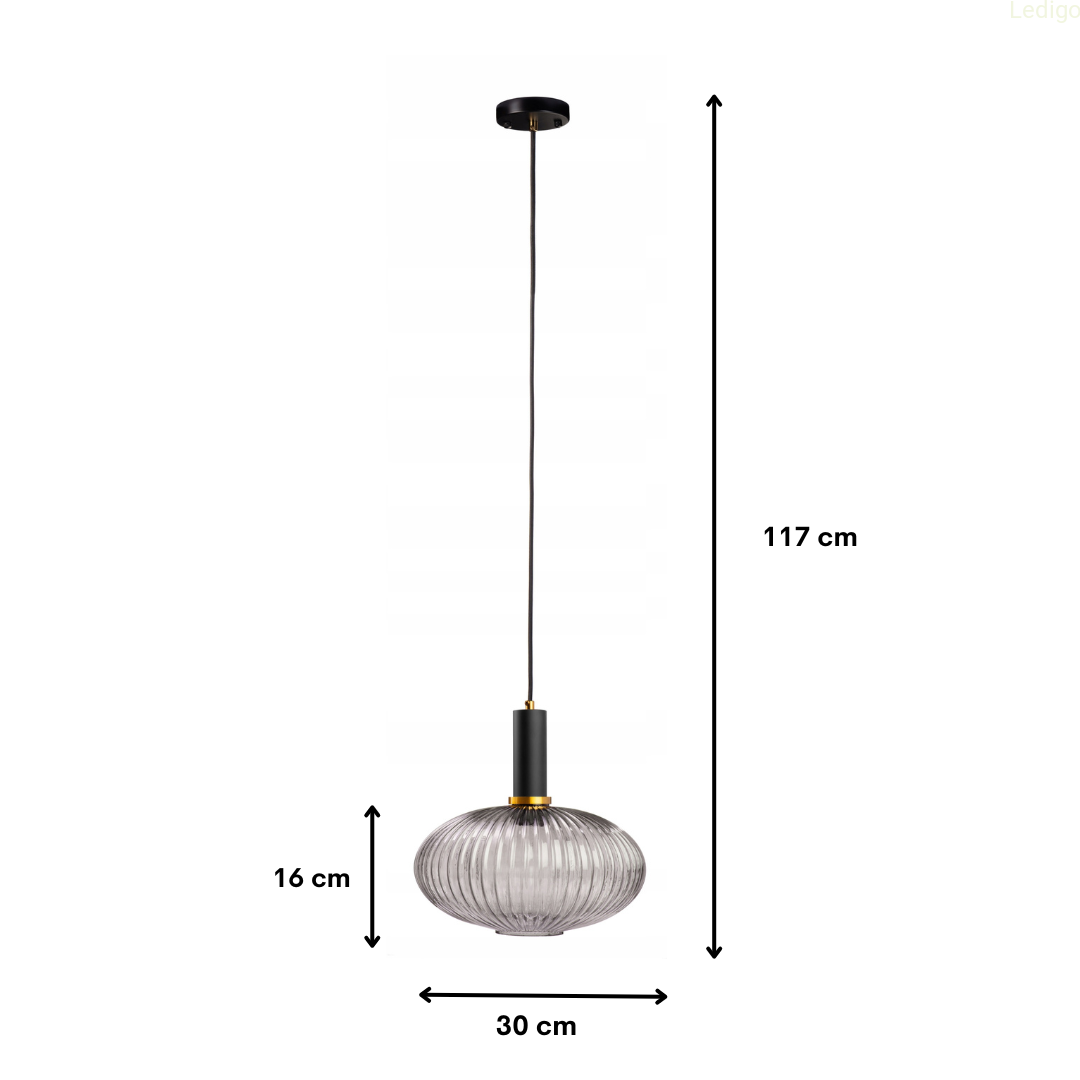 | Wymiary | maxymalna długość 117cm, wysokość klosza 16cm, wysokość klosza wraz z oprawą 29cm, średnica klosza 30cm, średnica otworu 9cm |