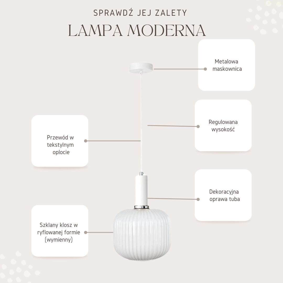 Co ważne lampa posiada możliwość regulacji wysokości zawieszenia. Przewód na którym jest zawieszona można swobodnie skrócić i zdecydować samemu na jakiej wysokości ma być zawieszony klosz lampy