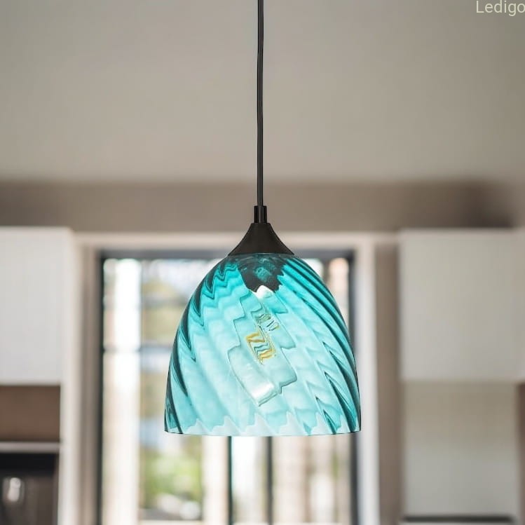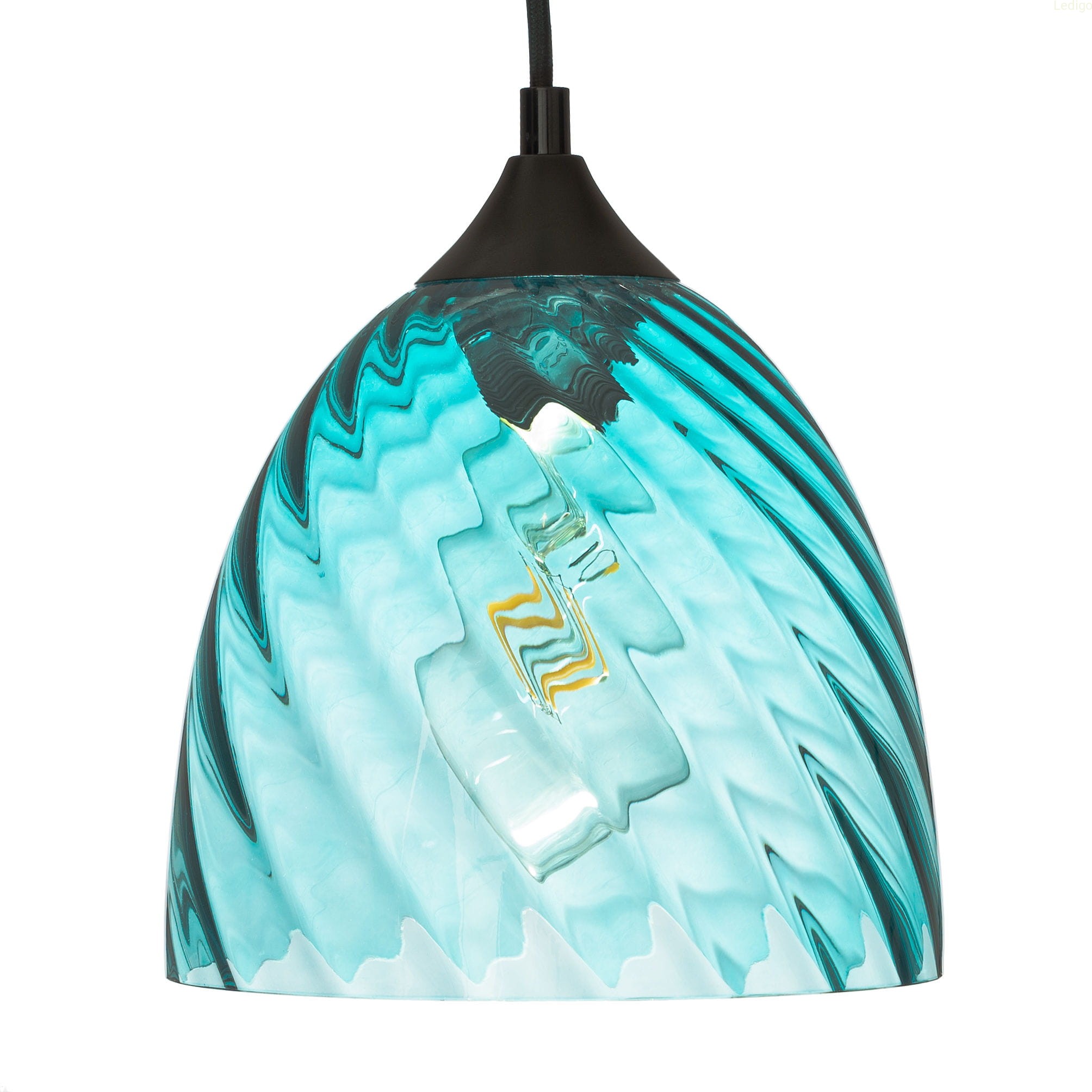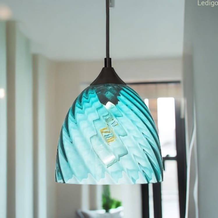 Lampa wisząca niebieska kopuła o niebieskim wybarwieniu szklanego klosza należy do oryginalnej serii VELA. Lampa posiada falistą strukturę szkła.