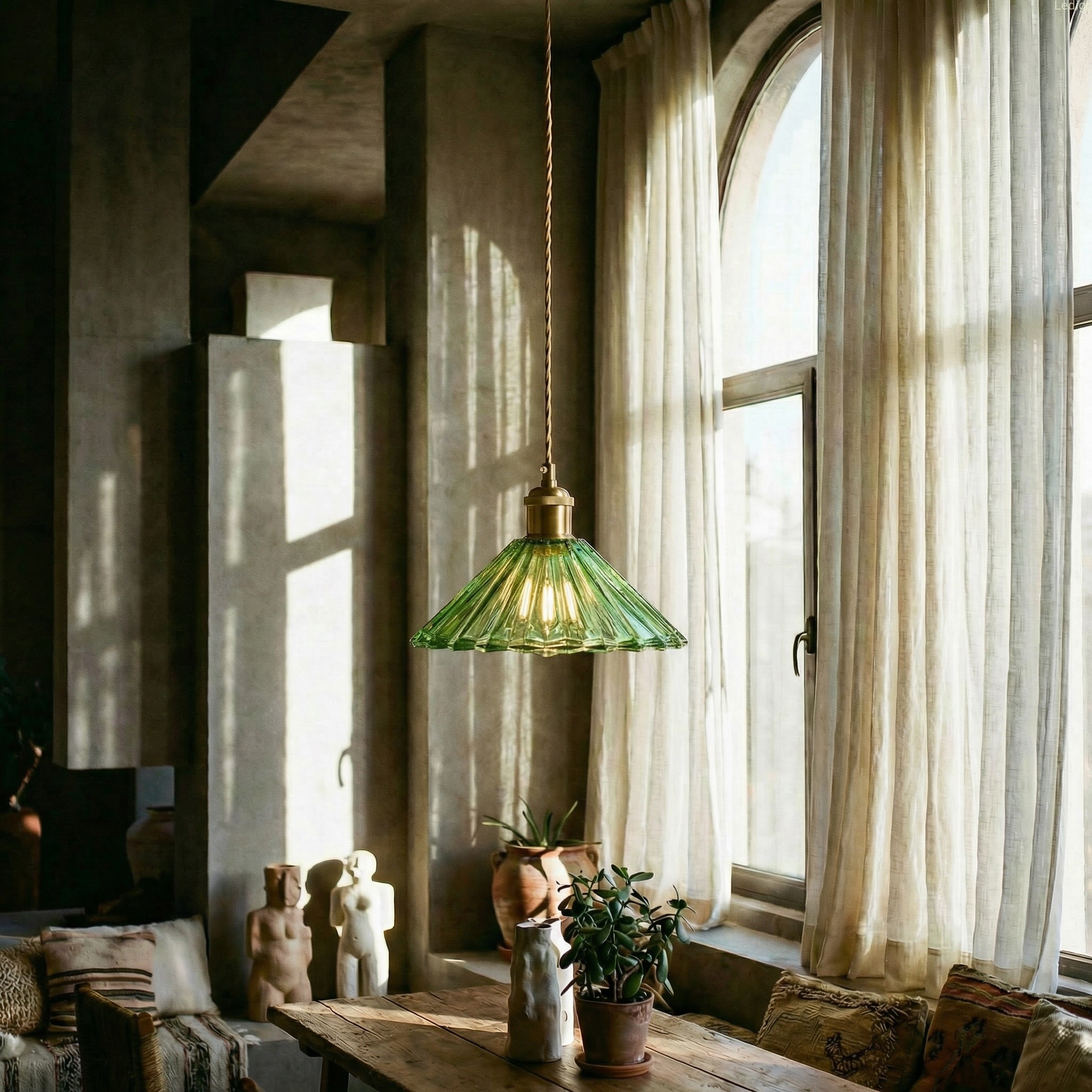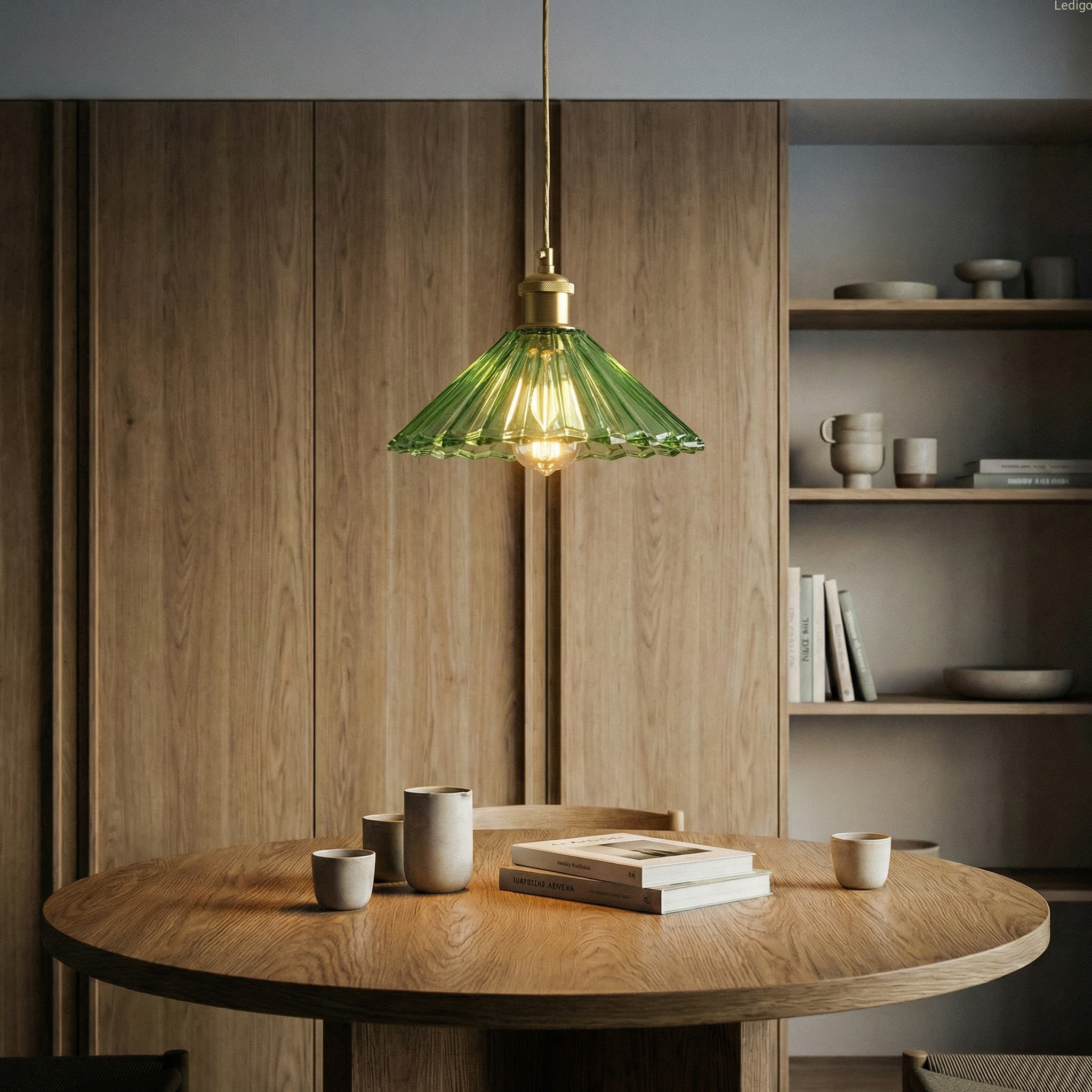 Lampa wisząca Japandi Green polskiej marki Ledigo to stylowe połączenie japońskiego minimalizmu ze skandynawską funkcjonalnością. Charakteryzuje się eleganckim, plisowanym kloszem wykonanym z przezroczystego zielonego szkła, który efektownie rozprasza światło, nadając wnętrzu przytulny klimat.