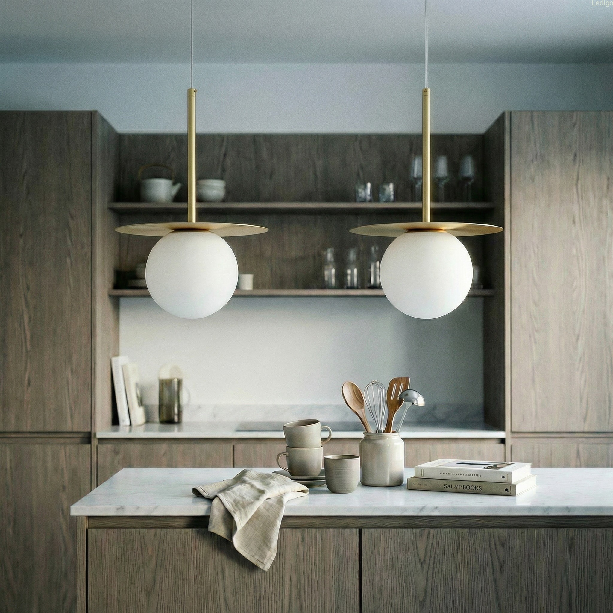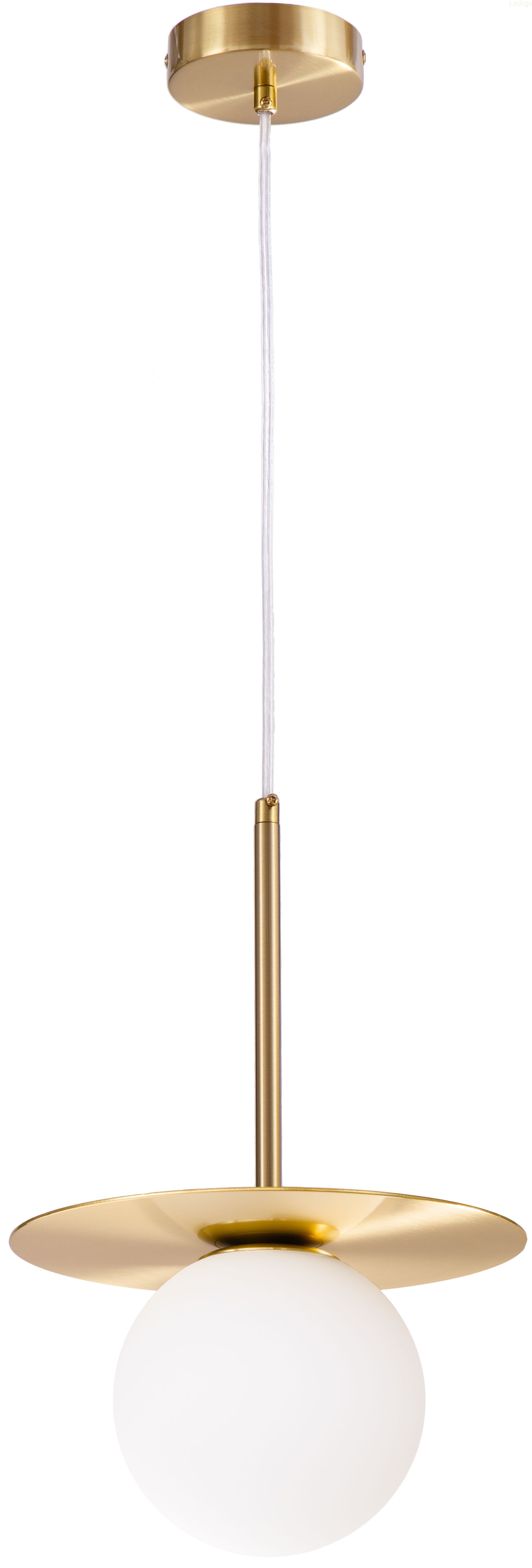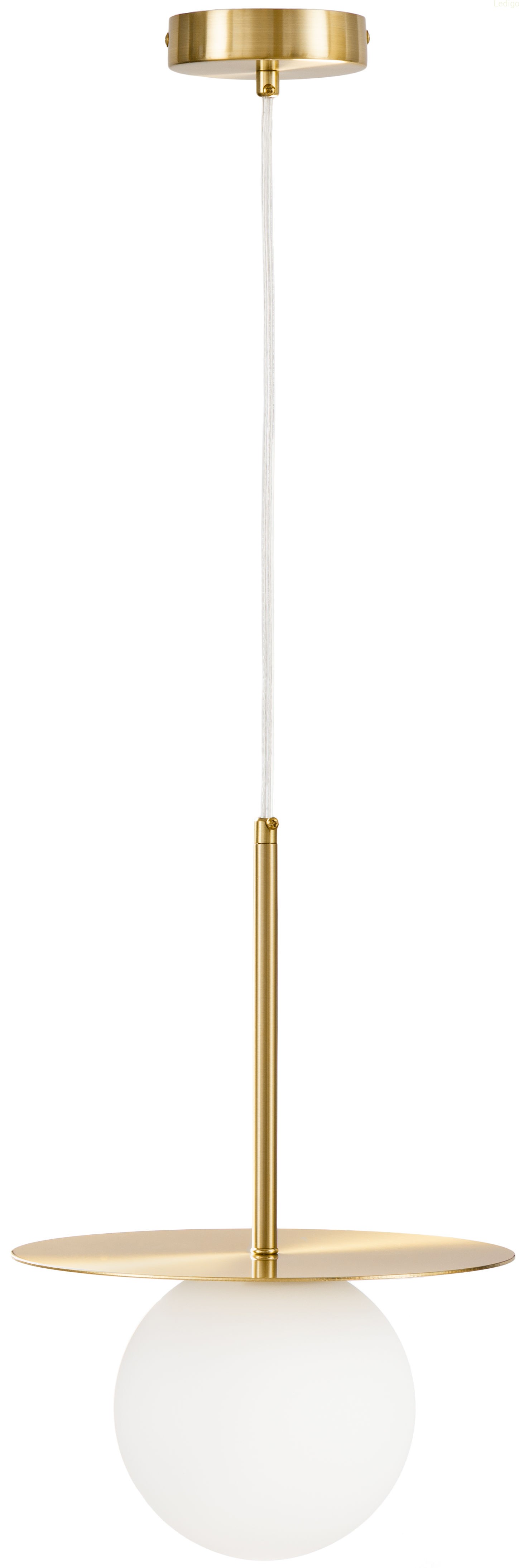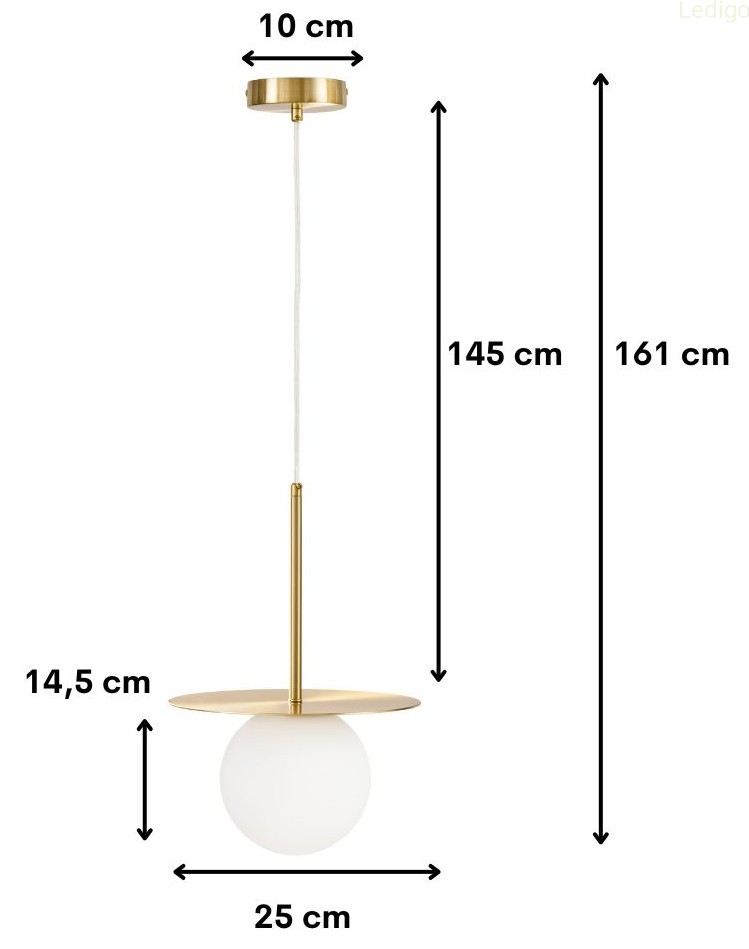 Lampa wisząca Aura Gold z firmy Ledigo wyróżnia się harmonijnym połączeniem geometrycznych form. Głównym elementem dekoracyjnym jest złoty talerz umieszczony tuż nad szklanym kloszem. Talerz ten nie tylko pełni funkcję ozdobną, ale również odbija światło wydobywające się z kuli, kierując je ku dołowi i na boki, co potęguje efekt blasku.