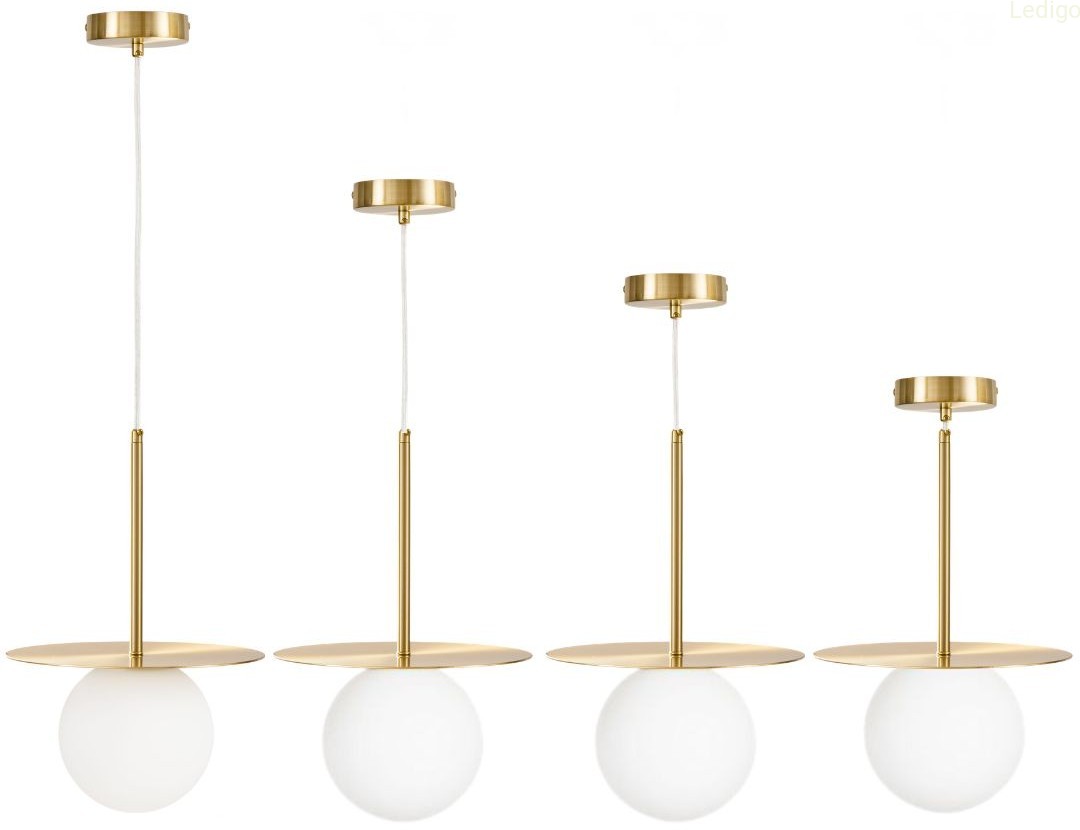 Rodzaj lampy: lampa sufitowa Dwuobwodowość: nie Rodzaj gwintu: E14 Styl: nowoczesny Tworzywo: metal + szkło Kolor klosza: mleczny Kolor uchwytu: złoty Kolor podstawy lampy: złoty Kolor podsufitki: złoty Wysokość całkowita: 161cm Szerokość całkowita: 25cm Głębokość klosza: 14cm Uwaga! Należy zastosować żarówkę o maksymalnej wysokości 10 cm Szerokość klosza: 14,5cm Wysokość klosza: 14,5cm Średnica maskownicy: 10cm Długość kabla: 145cm Waga produktu: 1,150kg Możliwość ściemniania: w zależności od żarówki Stopień ochrony IP: IP20 Regulacja wysokości: tak Napięcie: 230V Źródło światła w zestawie: nie Czas realizacji: 24h