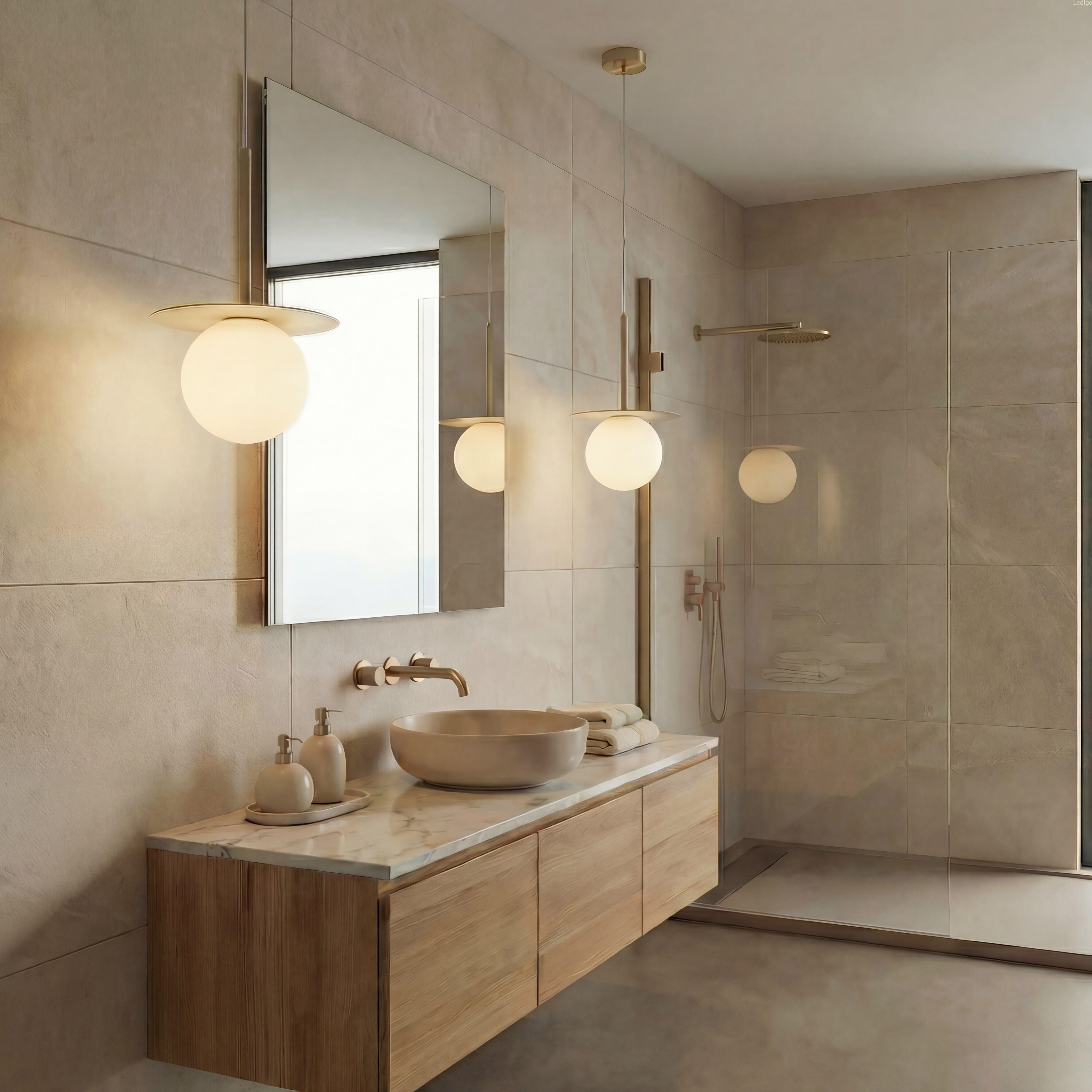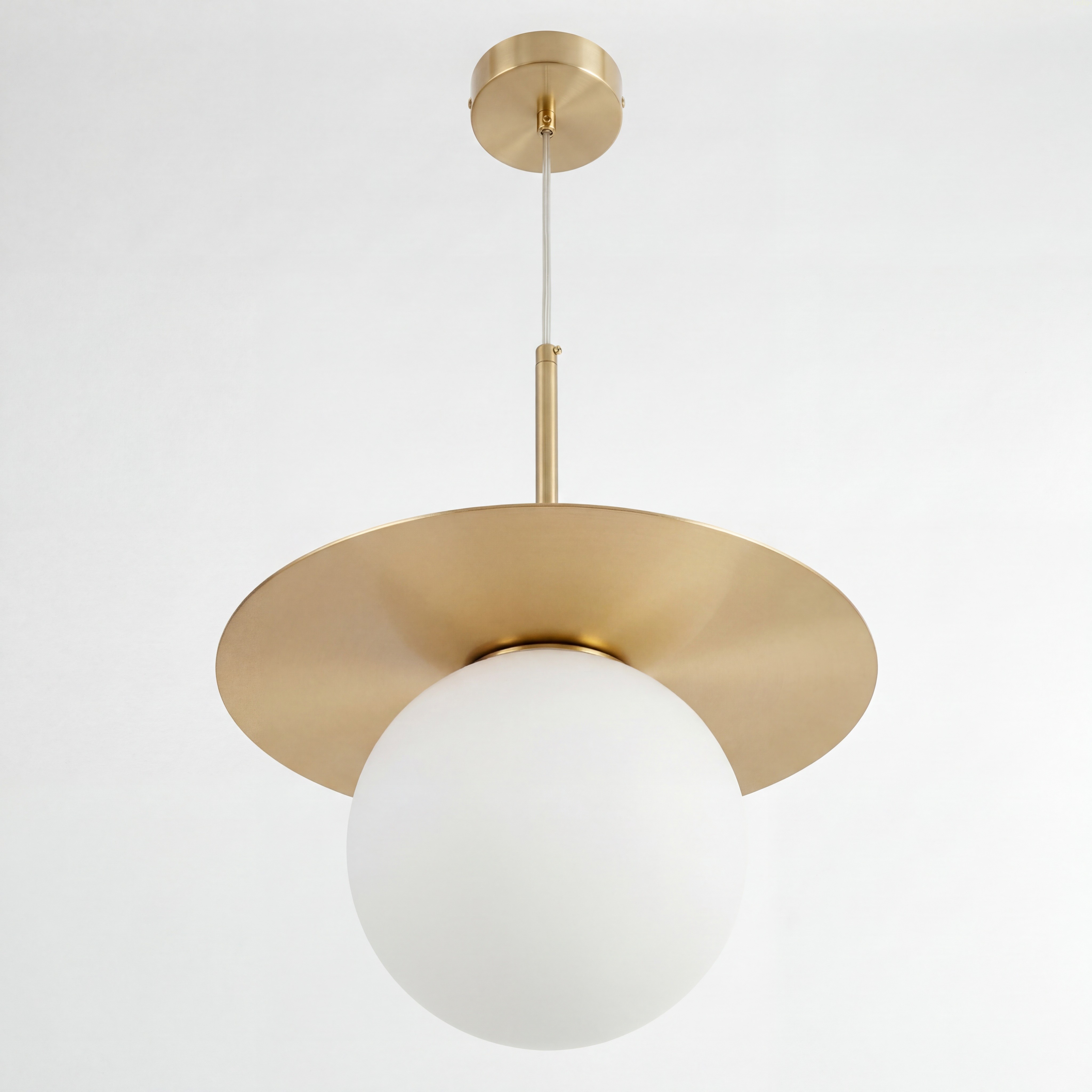 Połączenie surowego, płaskiego dysku z idealnie obłą, mleczną kulą wpisuje się w najgorętsze trendy modern retro i soft minimalism. Klosz wykonany jest z grubego, matowego szkła, które perfekcyjnie maskuje żarówkę i eliminuje cienie, wypełniając pomieszczenie kojącym, równomiernym blaskiem
