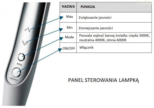 Dodatkowe atuty to ekonomiczność w użytkowaniu pobór mocy to zaledwie 10W, jej nowoczesny design, wysoka funkcjonalność i wysoka jakość z których jest wykonana. Czas użytkowania lampki szacuje się nawet do 50000h.