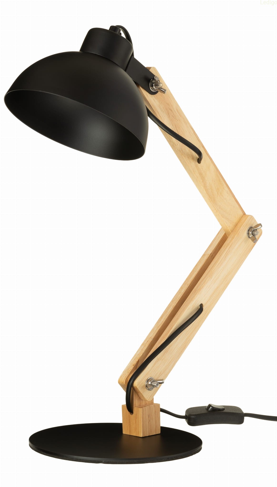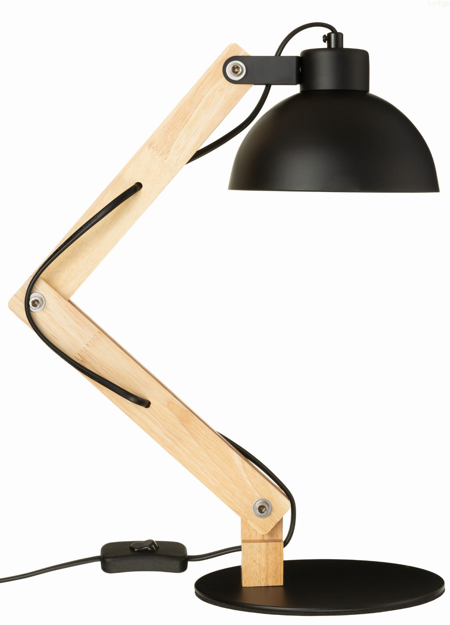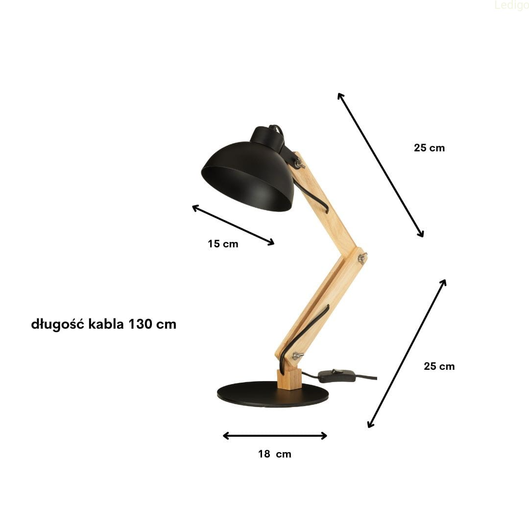 Rodzaj lampy: lampa stołowa Dwuobwodowość: nie Rodzaj gwintu: E27 Styl: nowoczesny Tworzywo: metal + drewno + tworzywo Kolor klosza: czarny Kolor uchwytu: Czarny Kolor podstawy lampy: Czarny Kolor kabla: Czarny Szerokość całkowita: długość 1-go przegubu 25 cm, długość 2-go przegubu 25 cm Szerokość klosza: 15,2 cm Wysokość klosza: 7,2 cm Średnica maskownicy: Średnica podstawy : 18 cm Długość kabla: 130 cm - włącznik ON/OFF znajduje się 10 cm od podstawy lampki Waga produktu: 1,200 kg Stopień ochrony IP: IP20 Regulacja wysokości: tak Napięcie: 230V Źródło światła w zestawie: nie