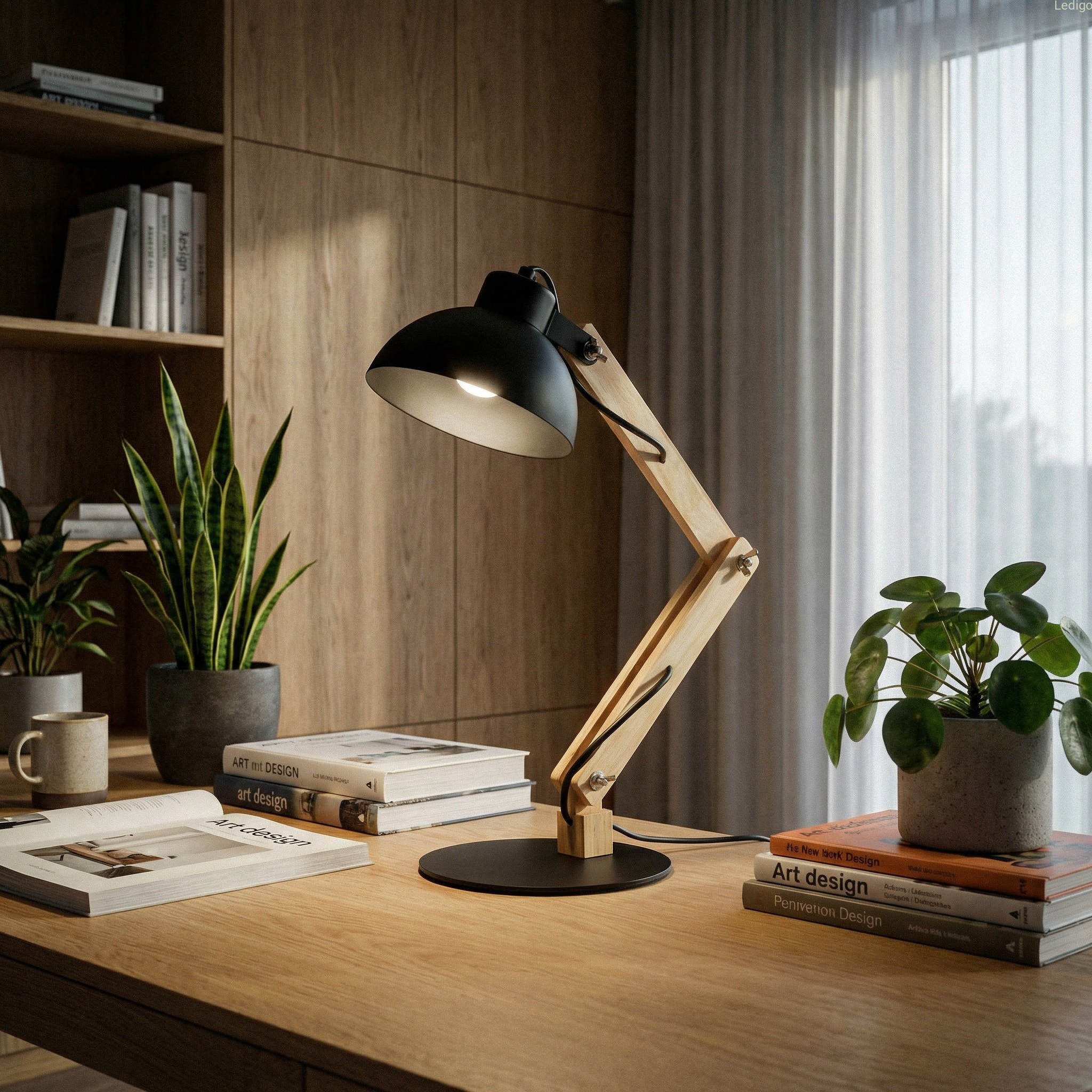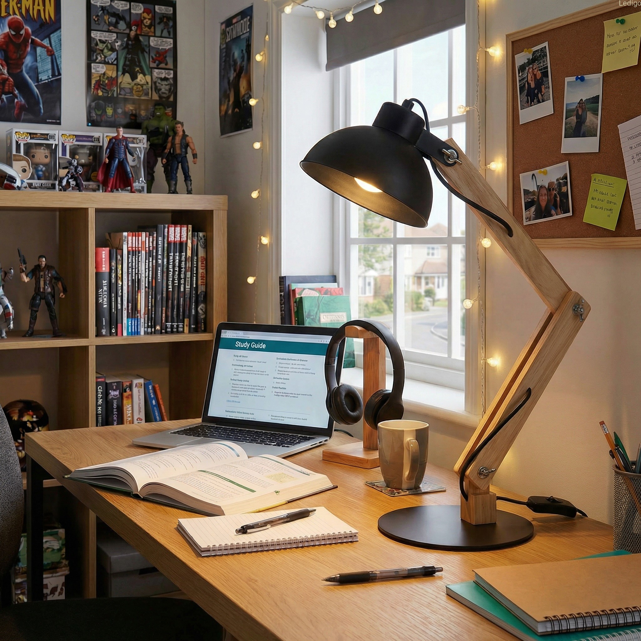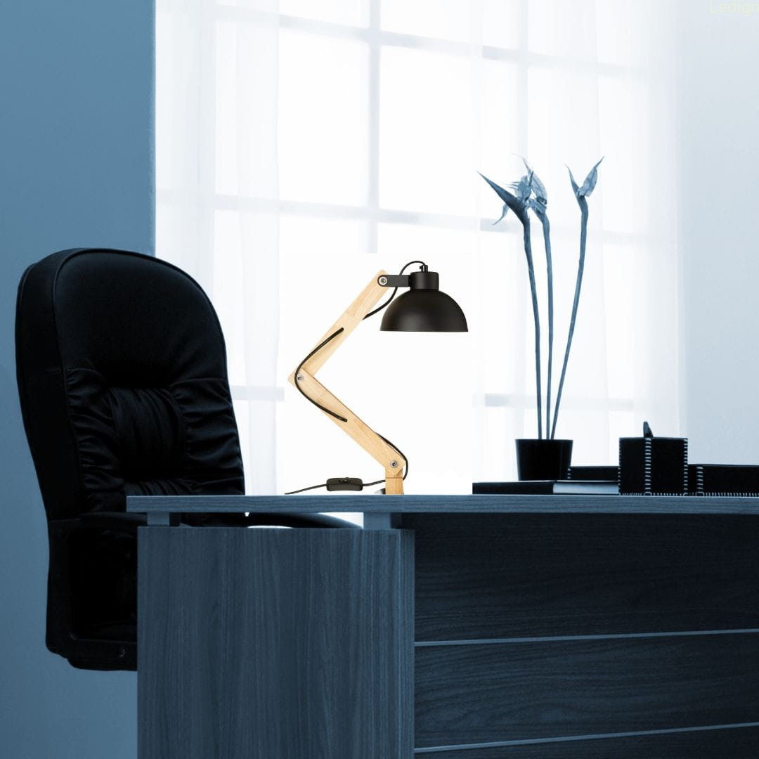 Lampka biurkowa Junior -  piękny skandynawski styl gdzie drewno łączy się z metalem. Idealna dla dzieci i młodzieży. Sprawdzi się również w biurze jak i gabinecie. Doświetli biurko bądź szafkę nocną.