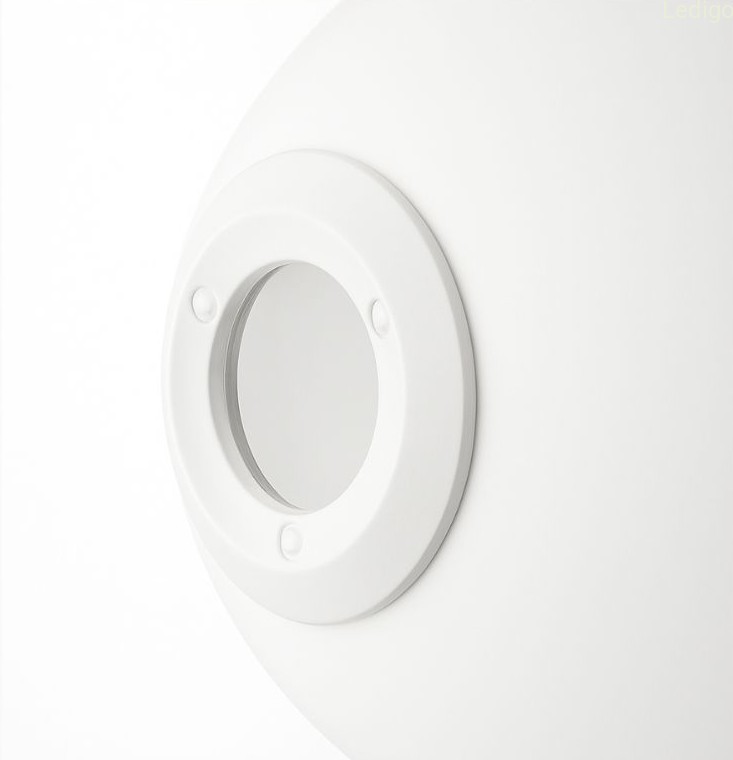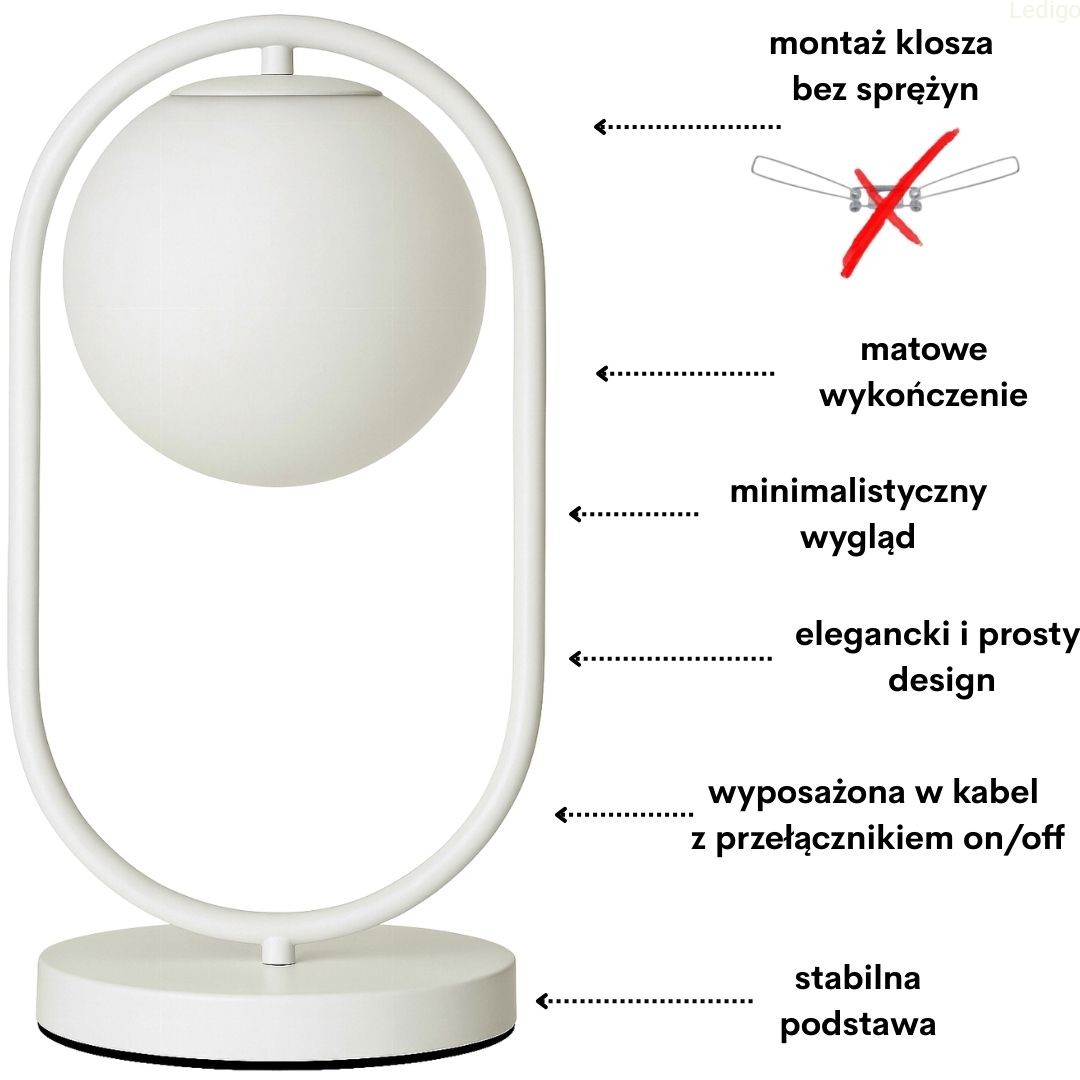 Stelaż lampy wykonany jest z metalu w kolorze białym (matowym), co nadaje jej wyrafinowanego, a jednocześnie subtelnego charakteru. Sercem lampy jest szklany, mlecznobiały klosz w kształcie kuli. Dzięki satynowemu wykończeniu szkła, światło jest miękko rozproszone, nie razi w oczy i tworzy w pomieszczeniu przytulną, intymną atmosferę.