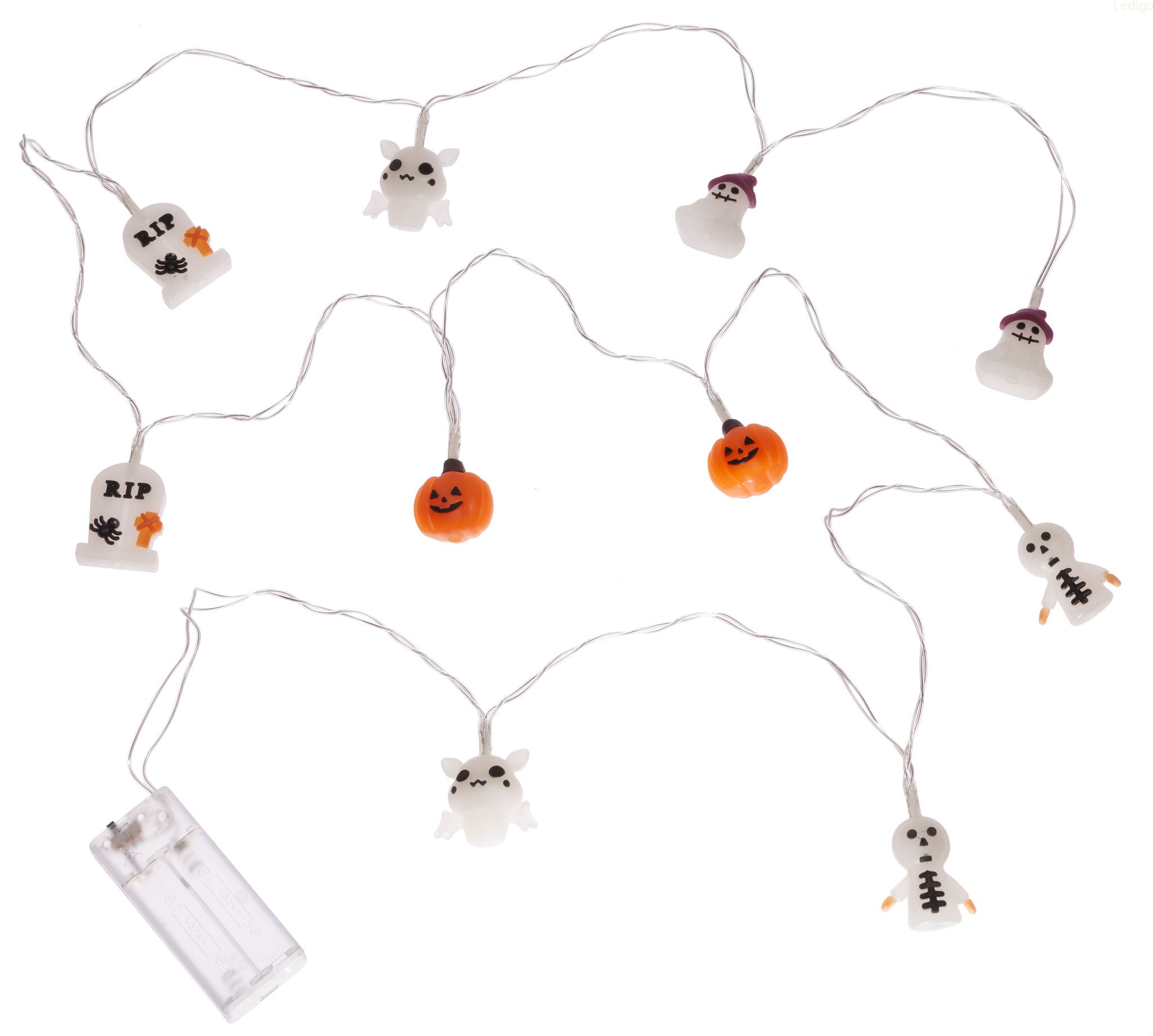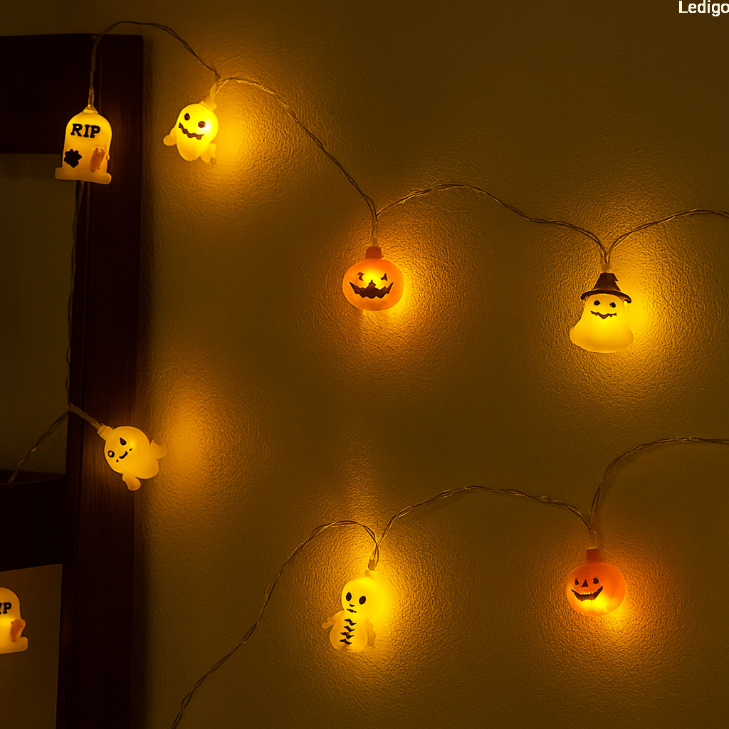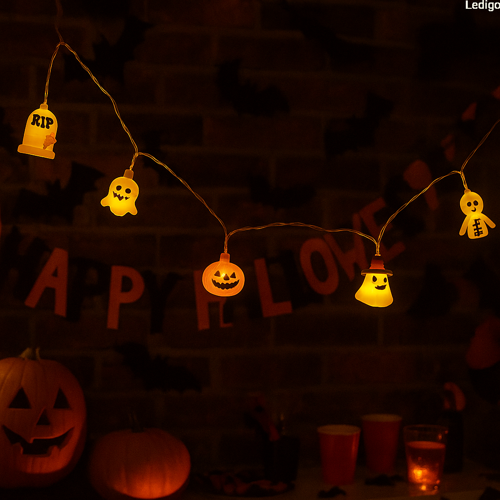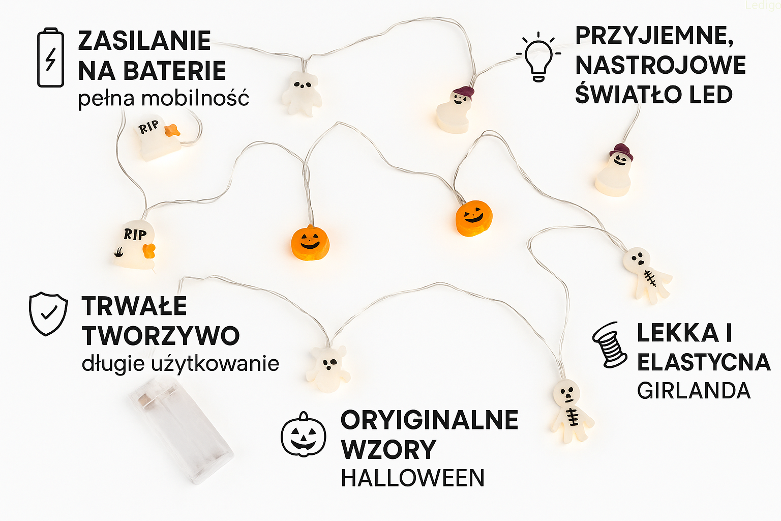 - Girlanda z lampkami w kształcie duchów, dyń i mumi idealnie pasujące do klimatu Halloween.