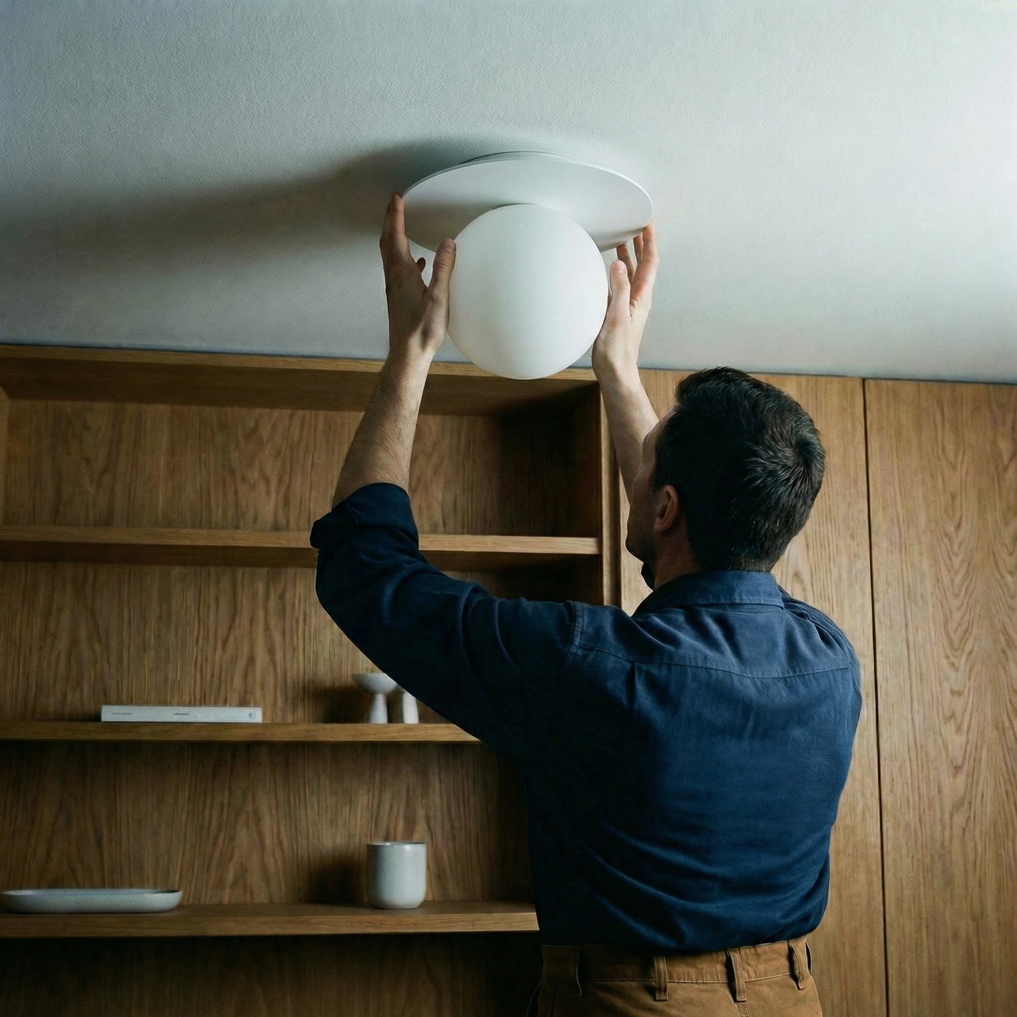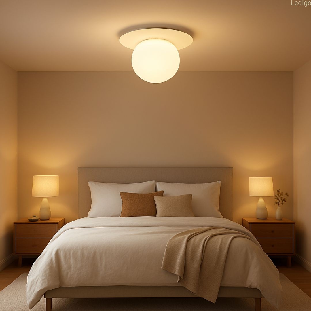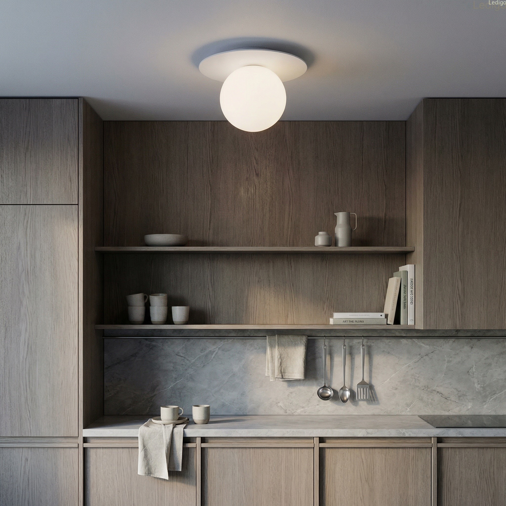 Połączenie surowego, płaskiego dysku z idealnie obłą, mleczną kulą wpisuje się w najgorętsze trendy modern retro i soft minimalism. Klosz wykonany jest z grubego, matowego szkła, które perfekcyjnie maskuje żarówkę i eliminuje cienie, wypełniając pomieszczenie kojącym, równomiernym blaskiem