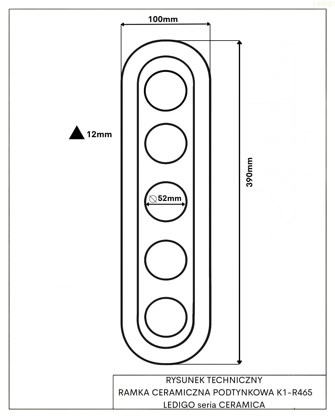 Wymiary długość ramki 390mm, wysokość ramki 100mm, średnica pojedynczego otworu montażowego 52mm, głębokość ramki 12mm