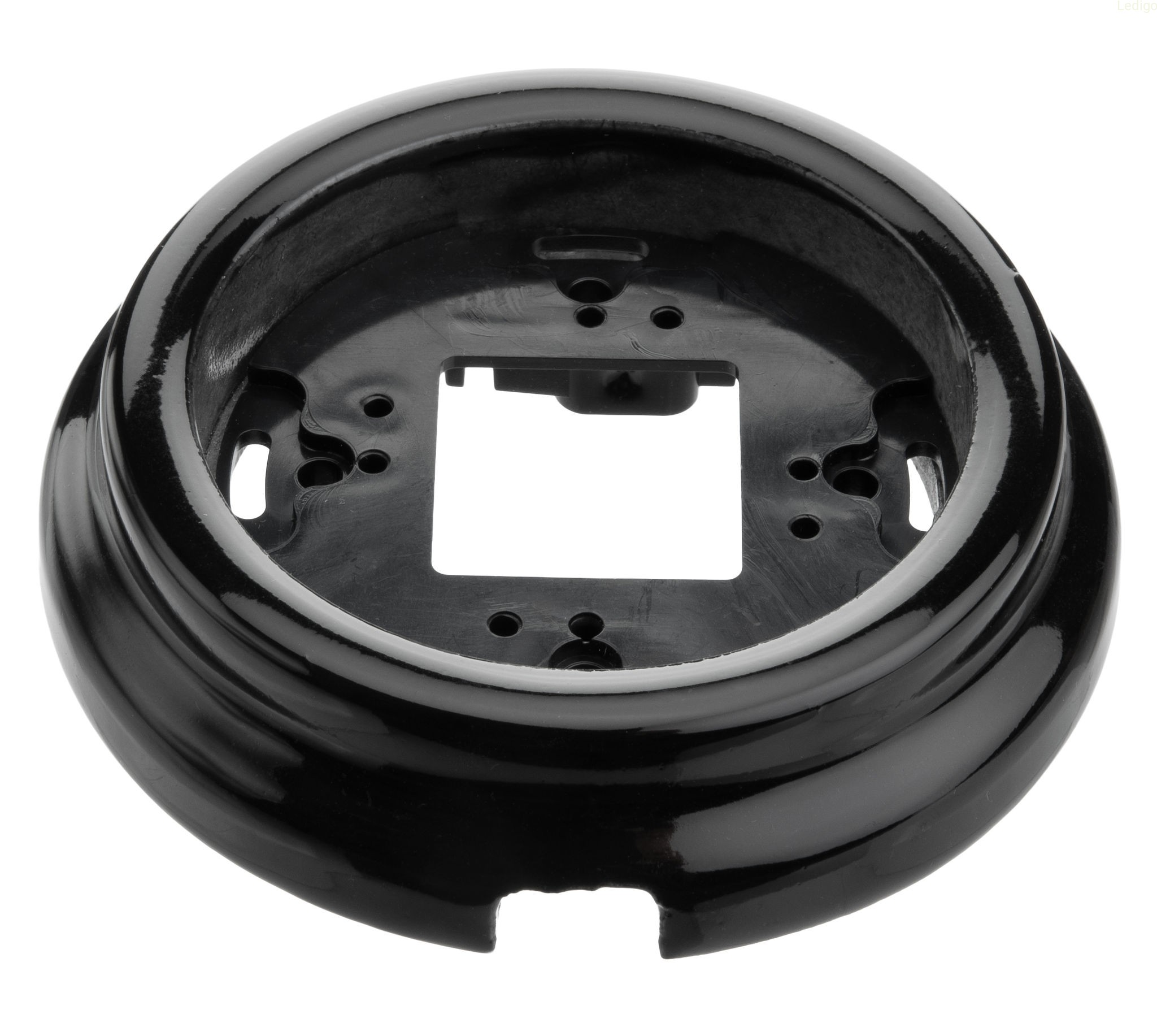 Typ montażu: natynkowy Materiał: ceramika Kolor: czarny Rodzaj: ramka Zastosowanie: wewnętrzne Klasa szczelności: IP20 Wymiary: średnica 100mm, średnica otworu montażowego 65mm, głębokość ramki 21mm
