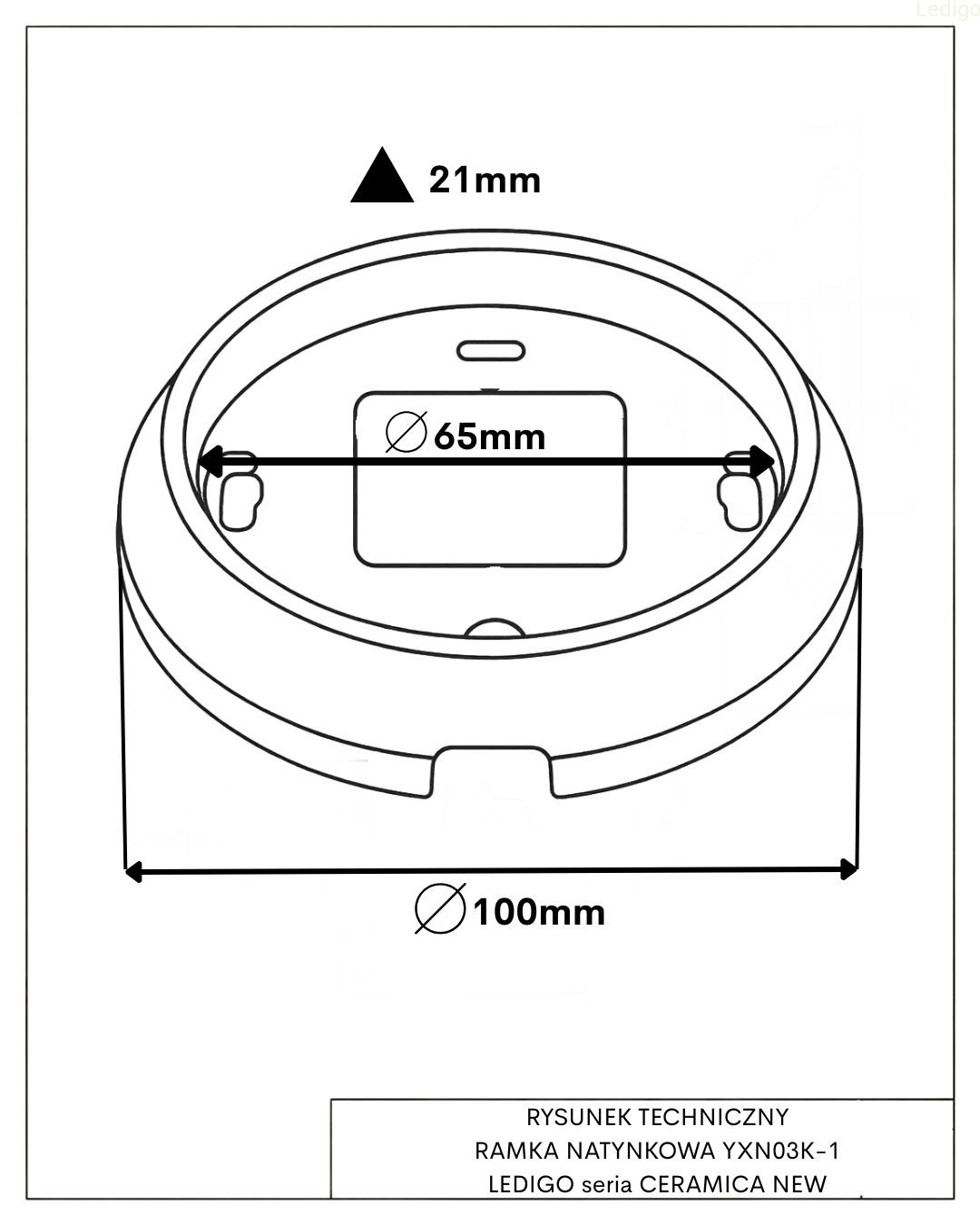 Wymiary średnica 100mm, średnica otworu montażowego 65mm, głębokość ramki 21mm