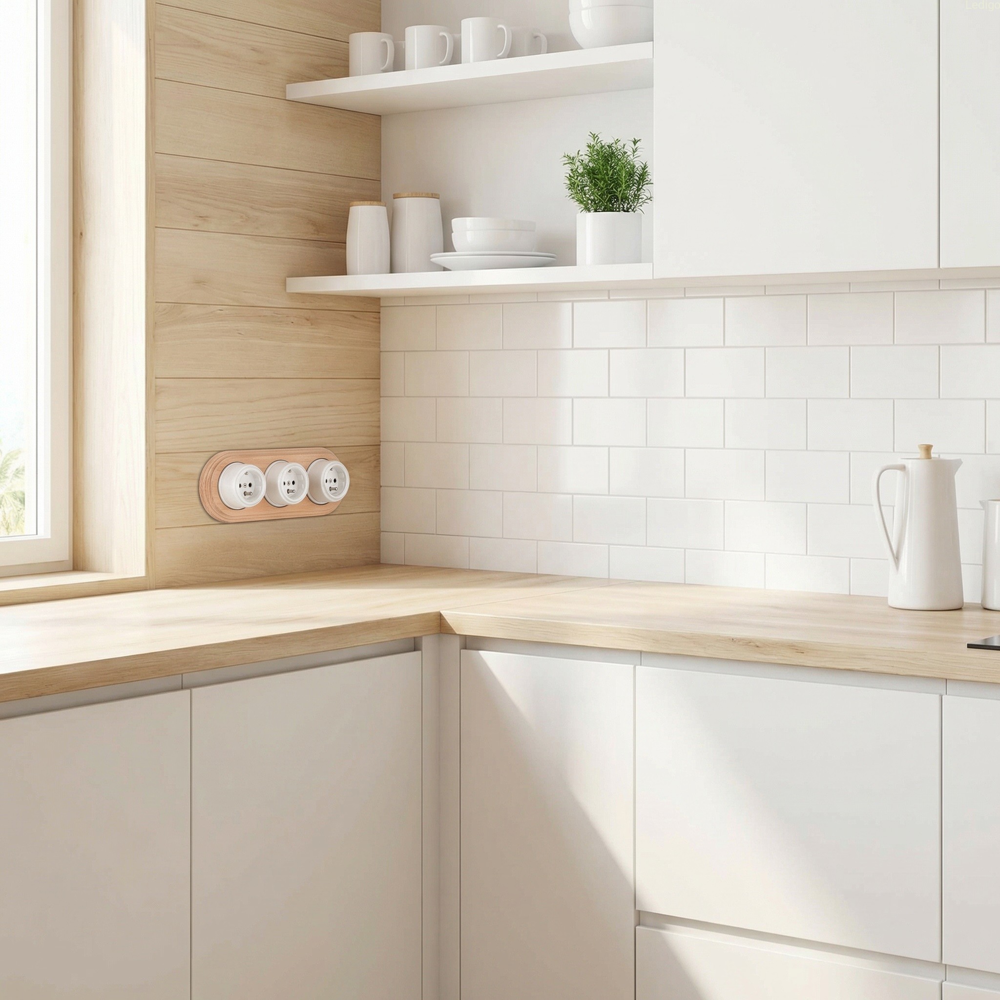 Ramka ma naturalny kolor drewna. Znakomicie komponuje się z bielą i czernią ceramicznych włączników oraz gniazd.