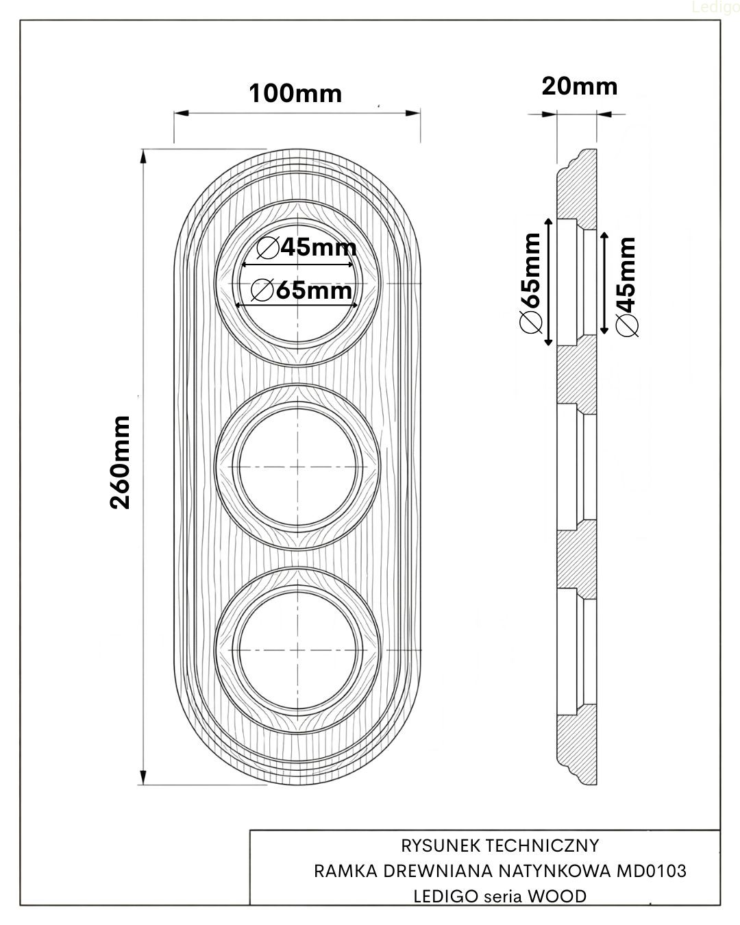 | Wymiary | długość ramki 260mm, wysokość ramki 100mm, średnica otworu montażowego 65mm, głębokość ramki 20mm |