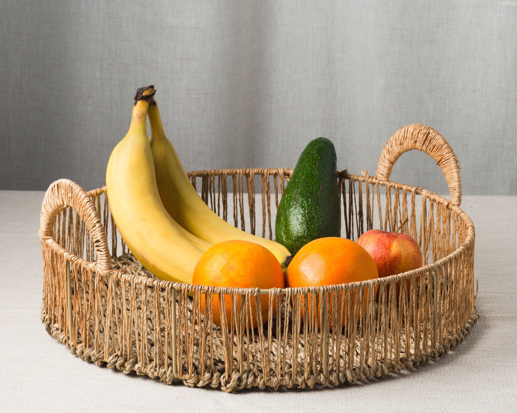 Okragła ręcznie pleciona taca lub kosz do serwowania, wykonany z naturalnych materiałów takich jak juta i trawa morska w kolorze naturalnego beżu. Posiada podwyższone, ażurowe ścianki oraz dwa solidne, wygięte uchwyty po przeciwnych stronach, ułatwiające przenoszenie.