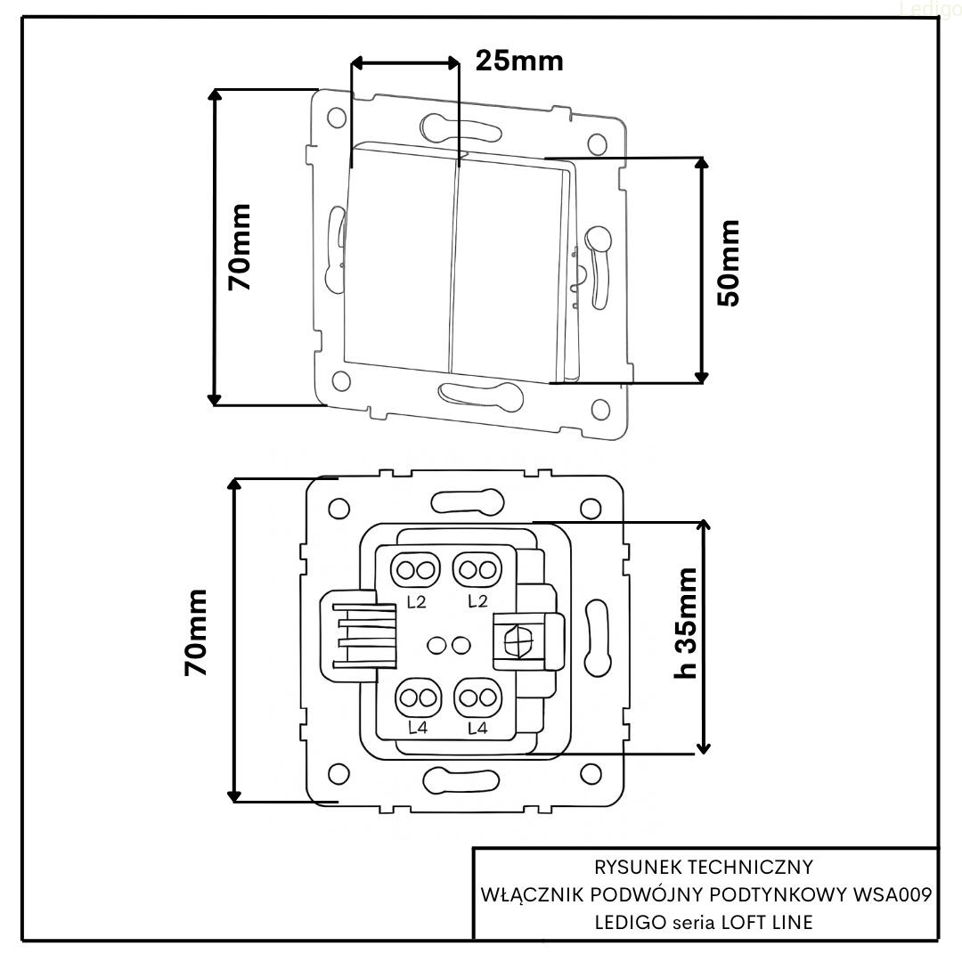 Wymiary ramka metalowa 70mm, biały włącznik 50mm, głębokość tyłu wchodząca w puszkę (montażowa) 35mm