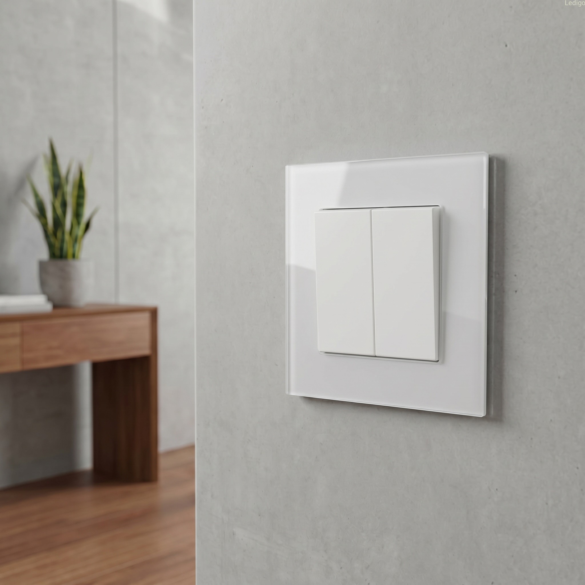 Włącznik podwójny schodowy bez ramki marki Ledigo z linii Loft Line, w eleganckim kolorze bieli o lekko satynowym wykończeniu z nutą delikatnego połysku.